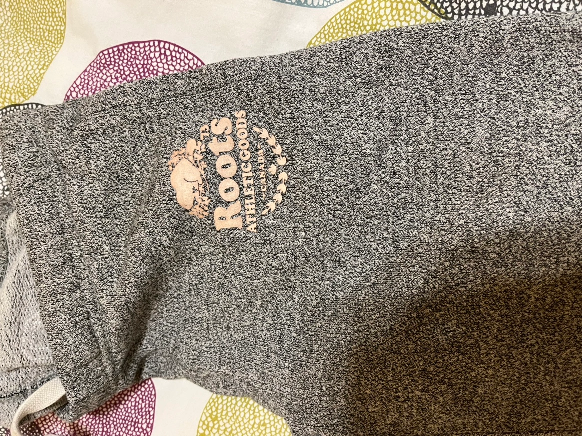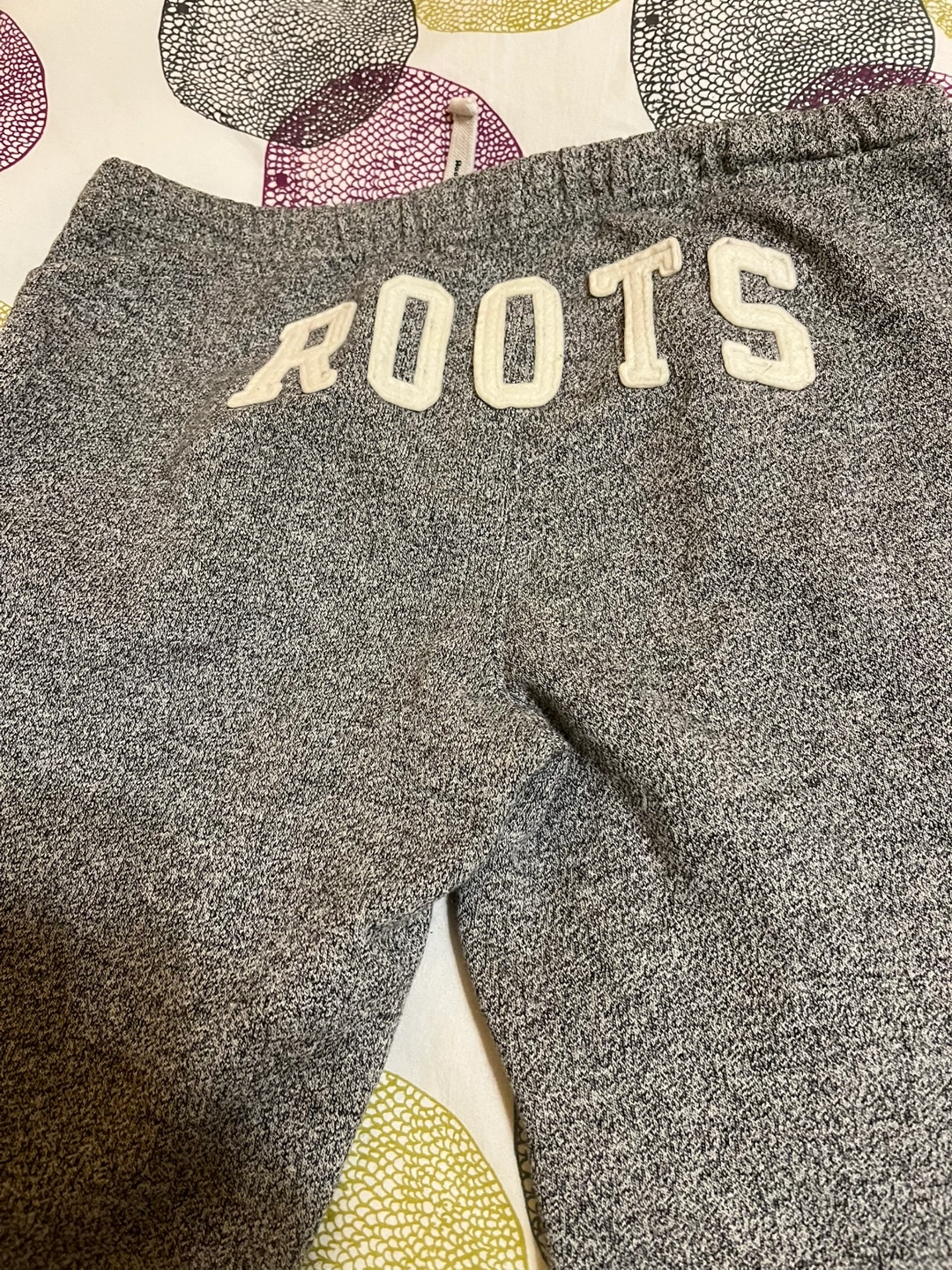 Grey heather joggers. Features a Roots logo on the back and leg. Elastic waistband and cuffs. Size XS but it can fit S or Medium.