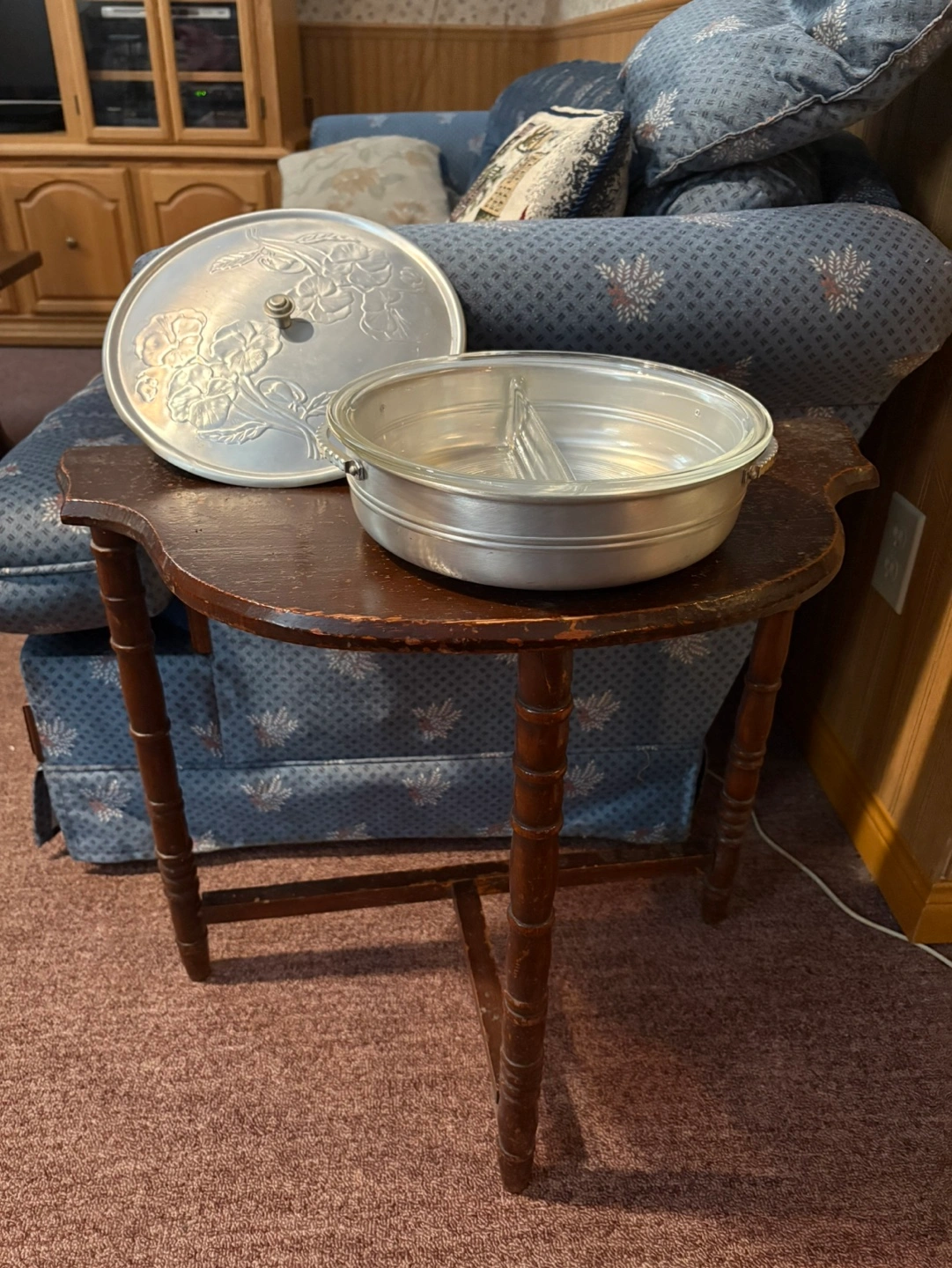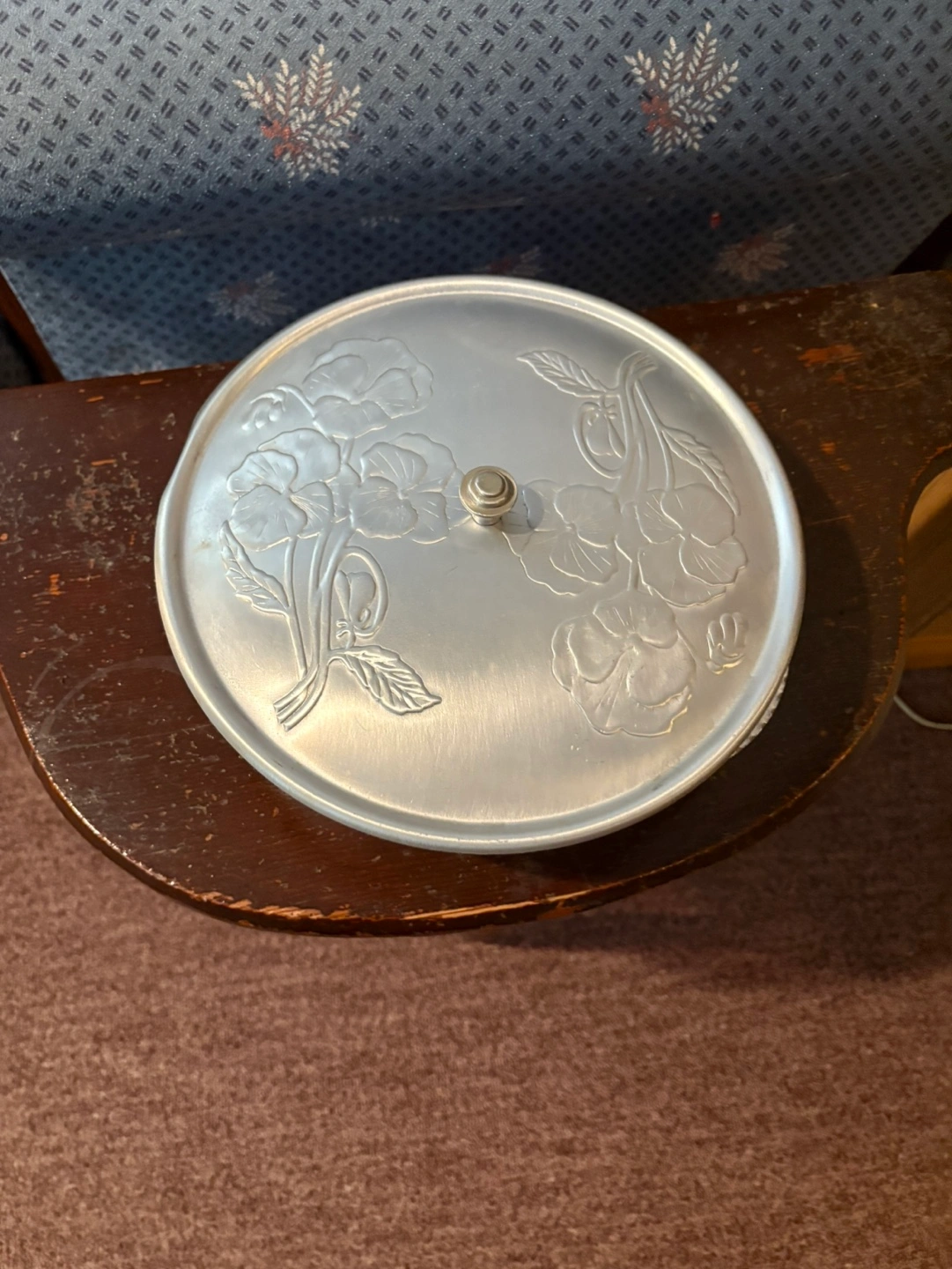 Three-compartment aluminum serving bowl with a floral-embossed lid. Includes a dark wood stand. Perfect for parties or entertaining. Vintage item, shows some wear.