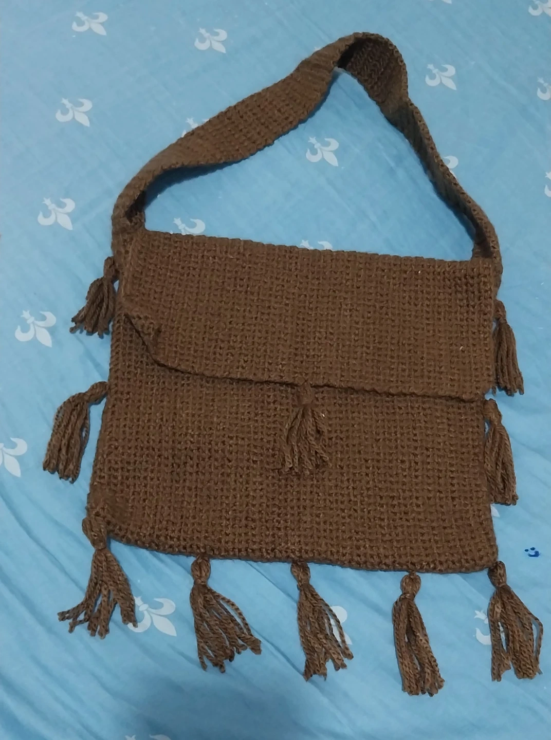 A lovely brown crocheted bag, perfect for everyday use. It features a secure flap closure and decorative tassels on the sides and bottom. This bag's durable crochet construction makes it a stylish and practical accessory. It's great for carrying essentials while adding a boho touch to any outfit!