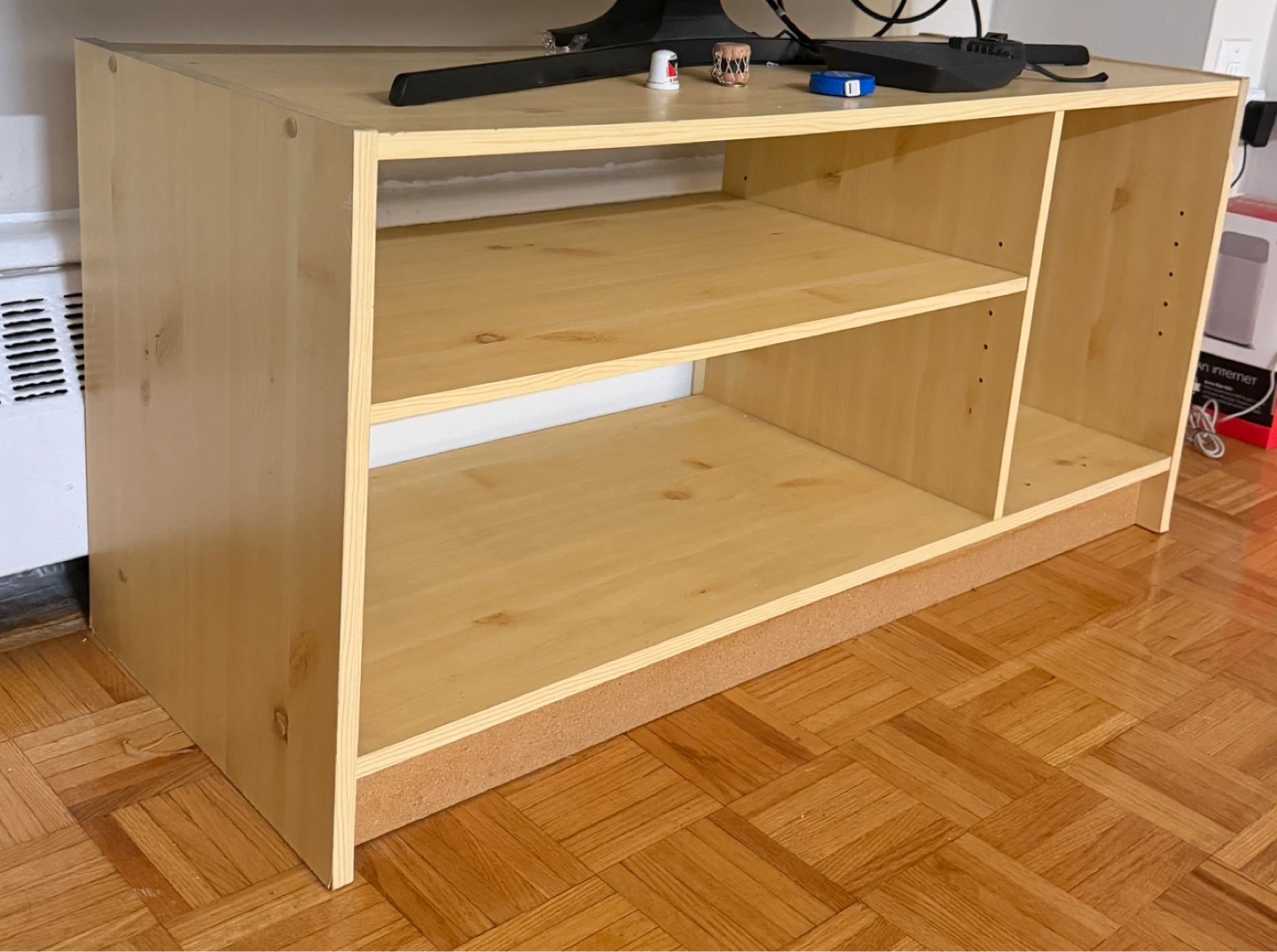 A simple wooden media console, perfect for holding your TV and media components. It's made of a light-coloured wood material and has two open shelving sections. A flat panel piece is included which serves as shelf at the wider side , It is adjustable depending on your need