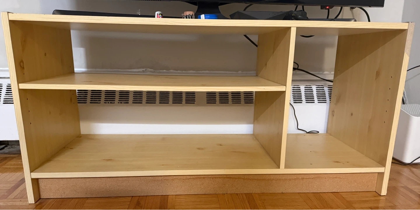 A simple wooden media console, perfect for holding your TV and media components. It's made of a light-coloured wood material and has two open shelving sections. A flat panel piece is included which serves as shelf at the wider side , It is adjustable depending on your need