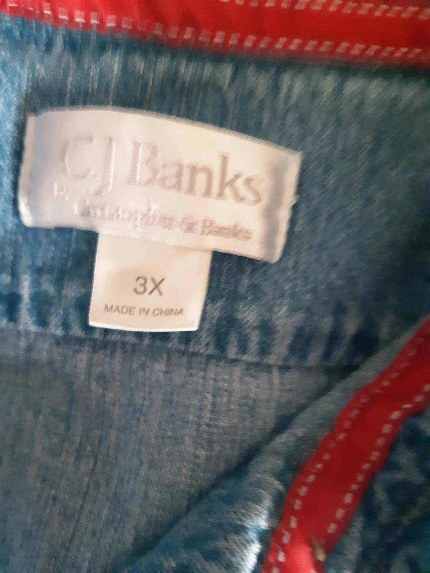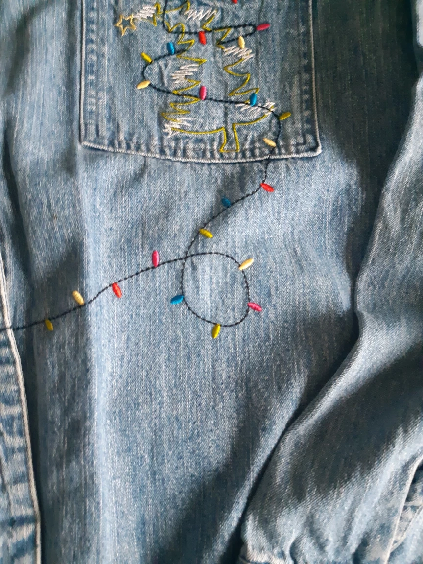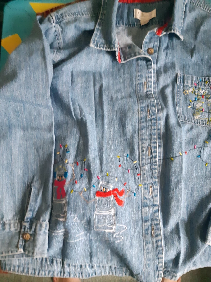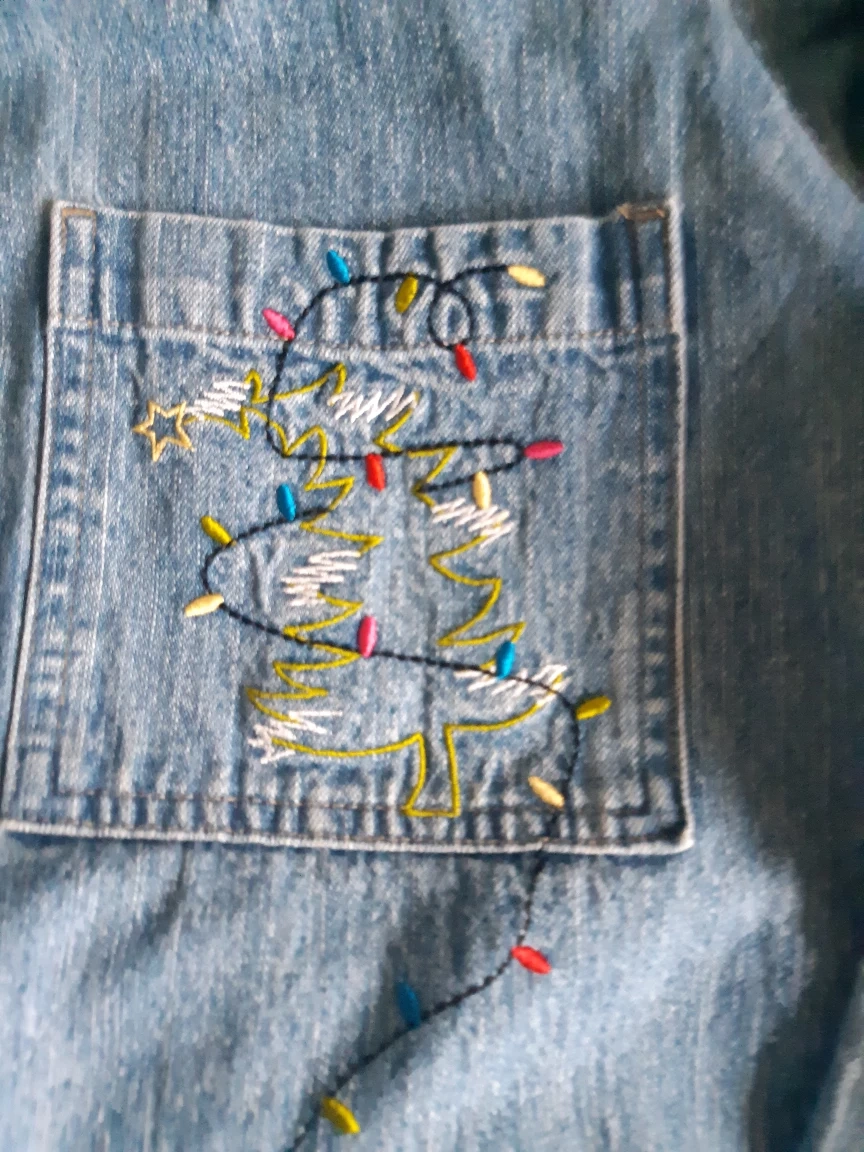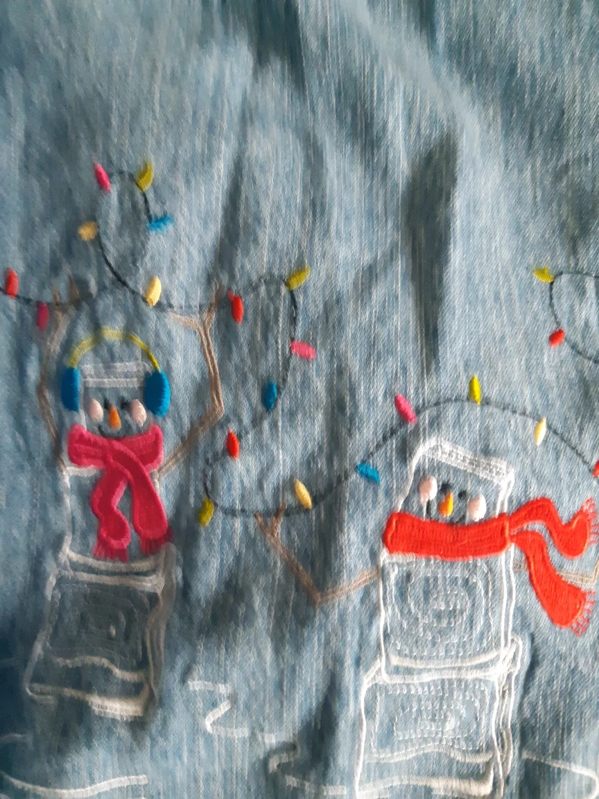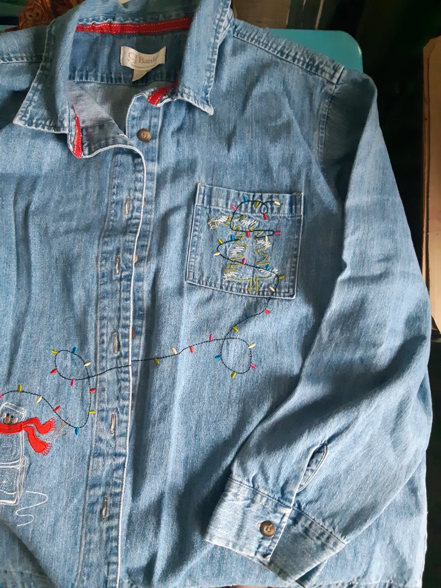 Blue denim shirt with Christmas embroidery. Features two snowmen holding up Christmas lights. Pocket has embroidered Christmas tree with lights. Long sleeves with button cuffs.