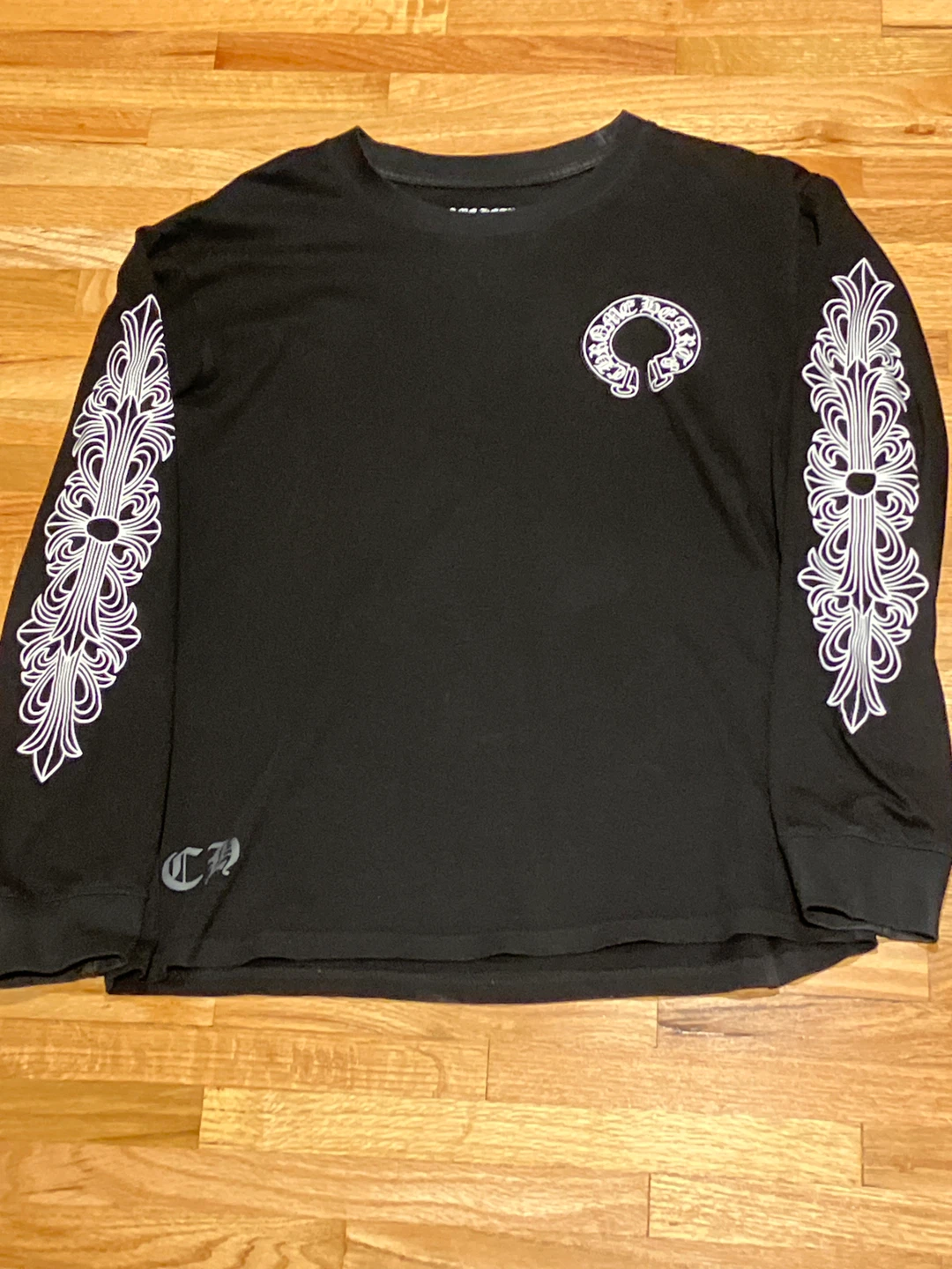 Selling a Chrome Hearts long sleeve shirt in black. It has the classic Chrome Hearts logo and design on the sleeves and back. Great for adding a bit of edge to your wardrobe!