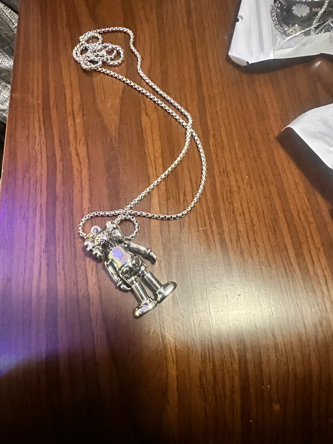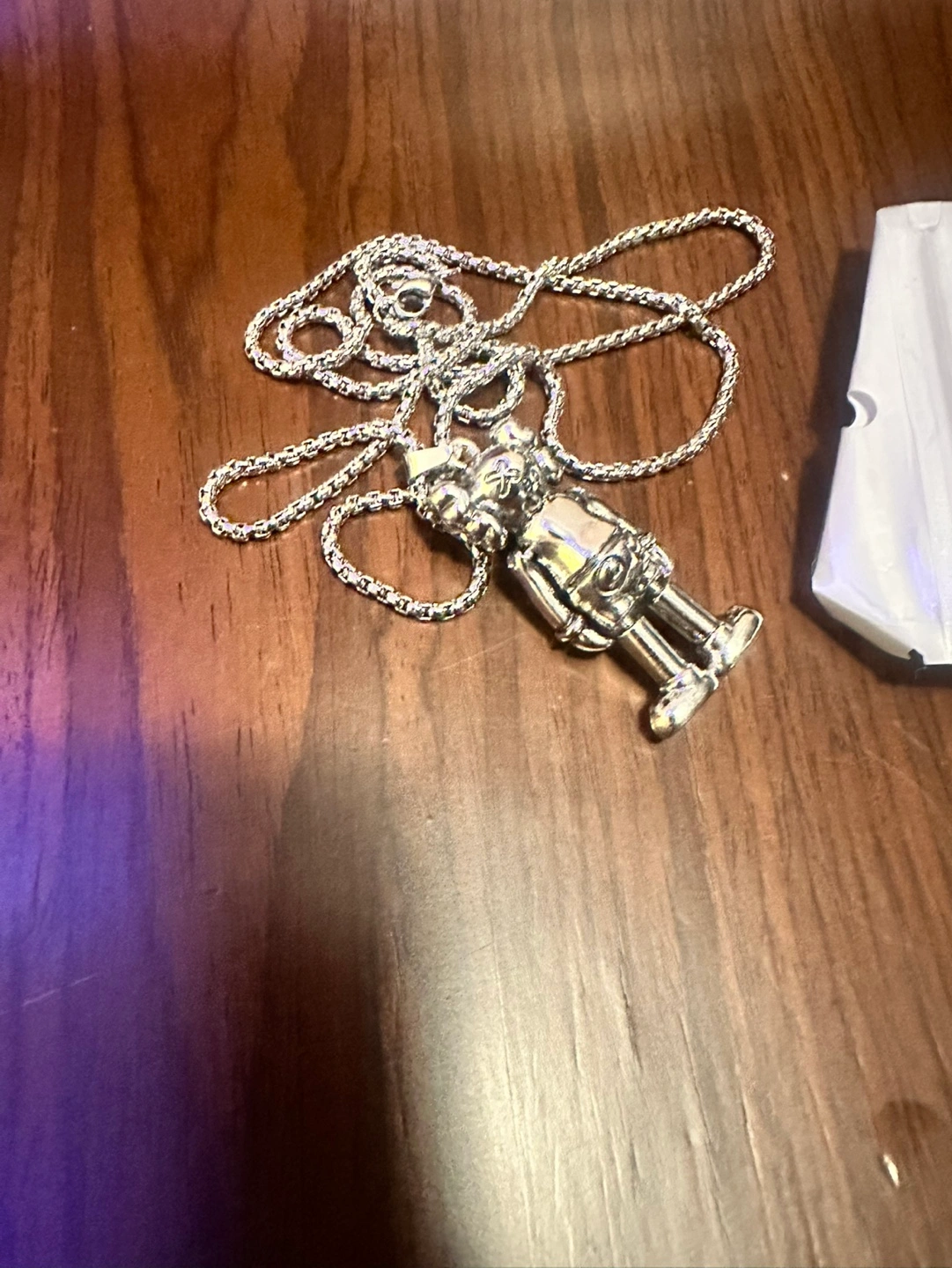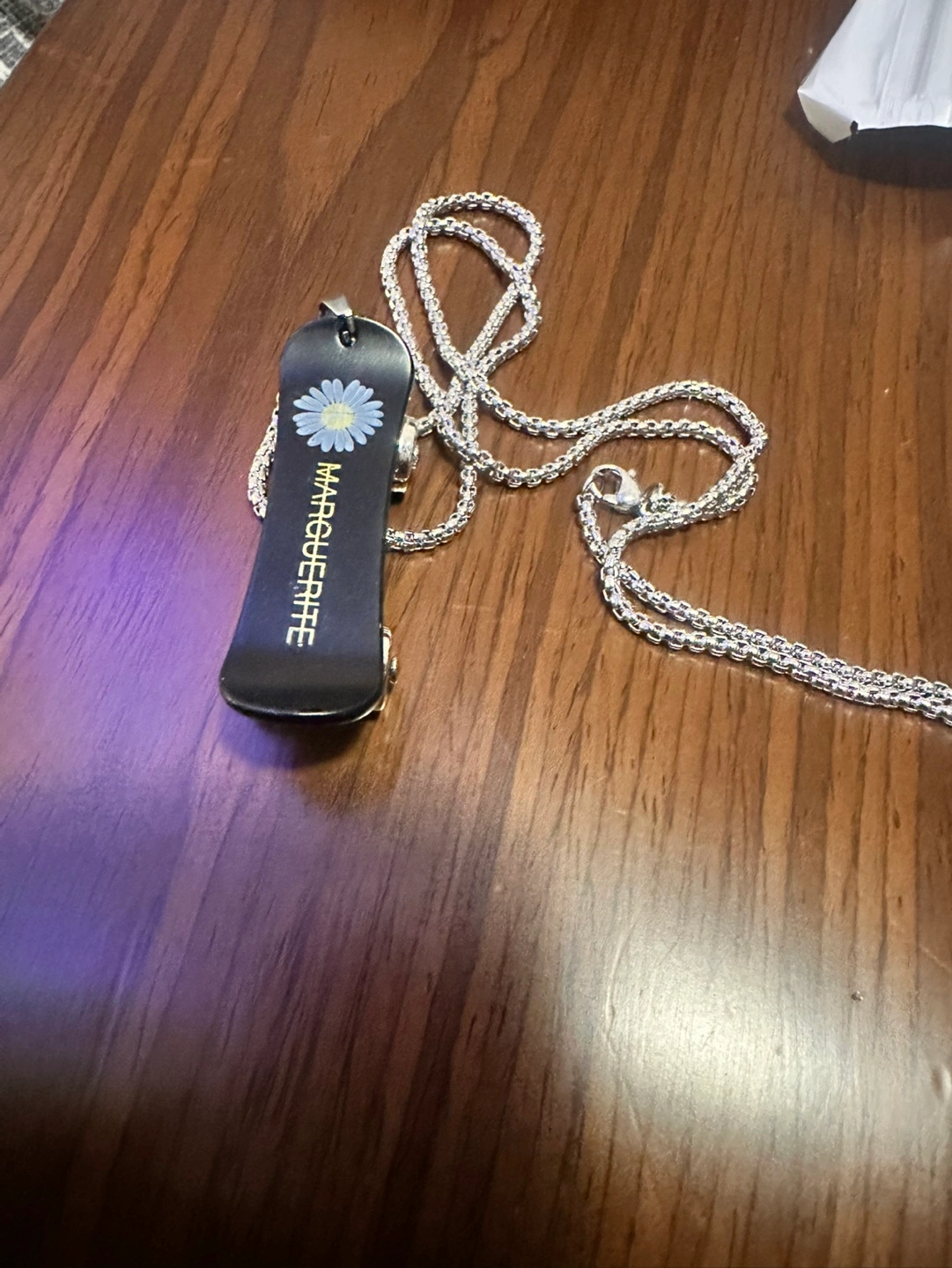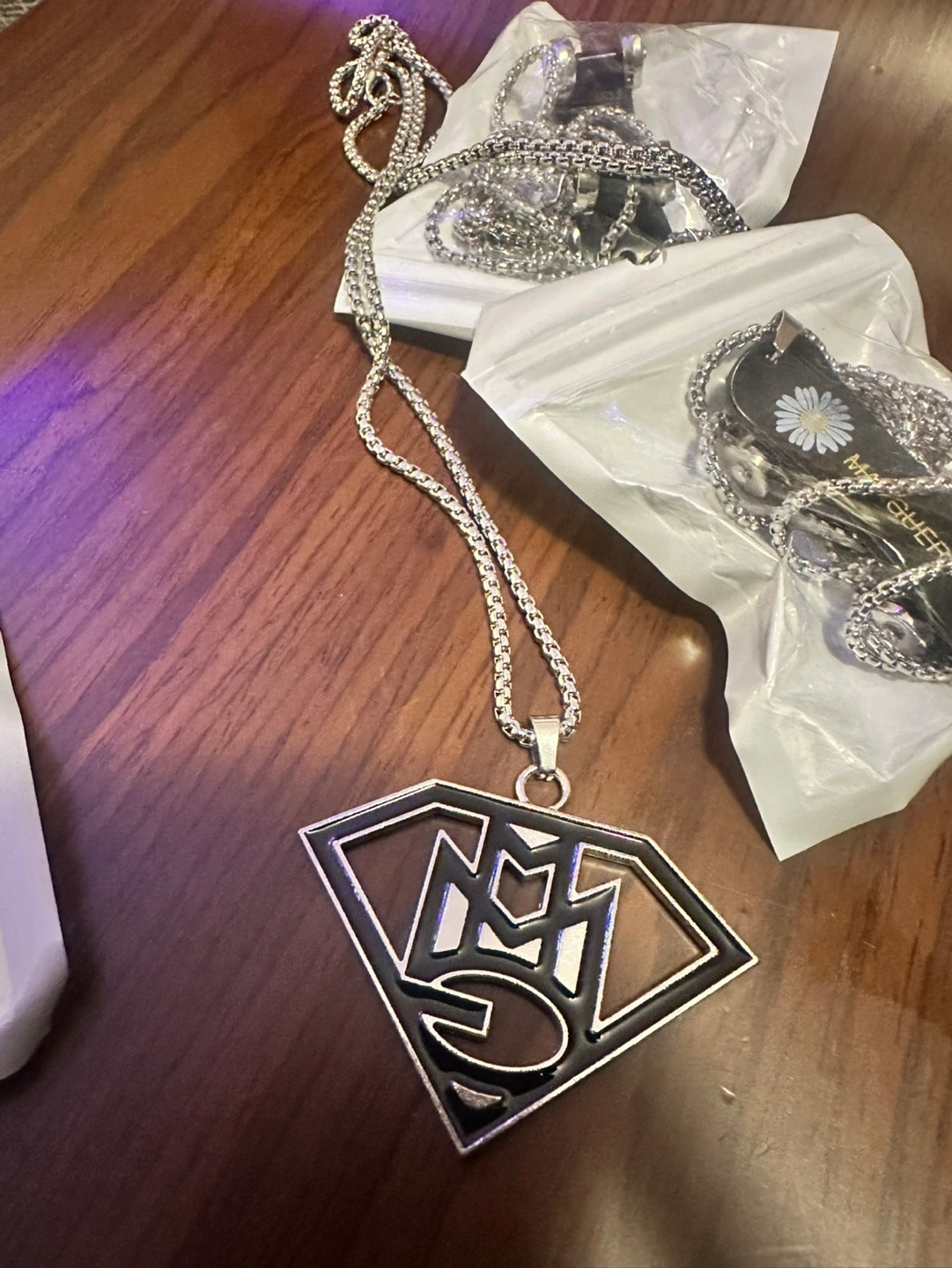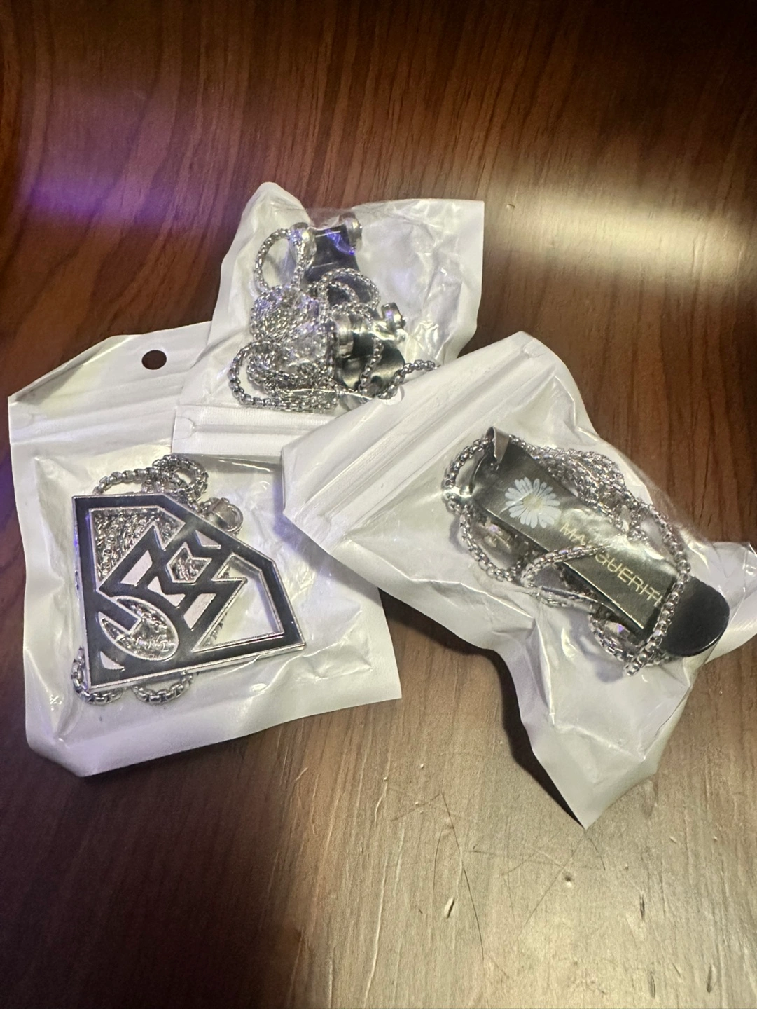 Three necklaces with different pendants. One features a miniature skateboard, another a logo, and the last a stylized figure. Silver chains included. New, never worn.