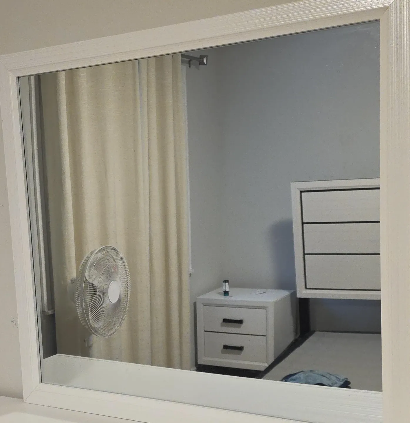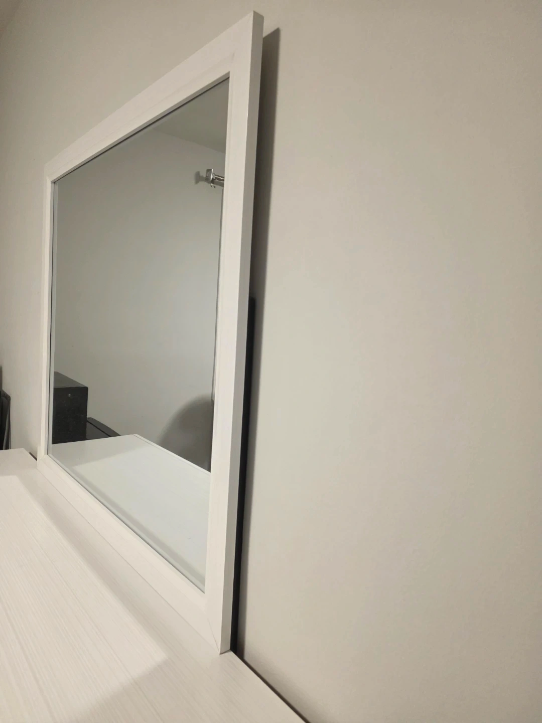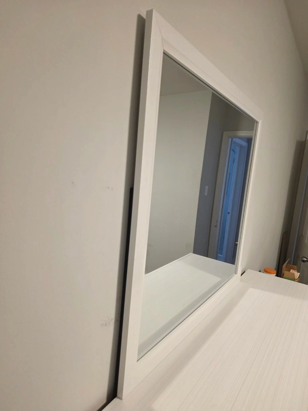 This is a white framed wall mirror. It's a simple and classic design that would fit into many decors. The frame is clean and the mirror itself is in good condition.
