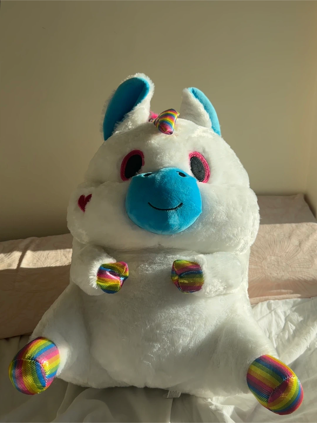 Large white unicorn plush toy, about 15 inches tall.