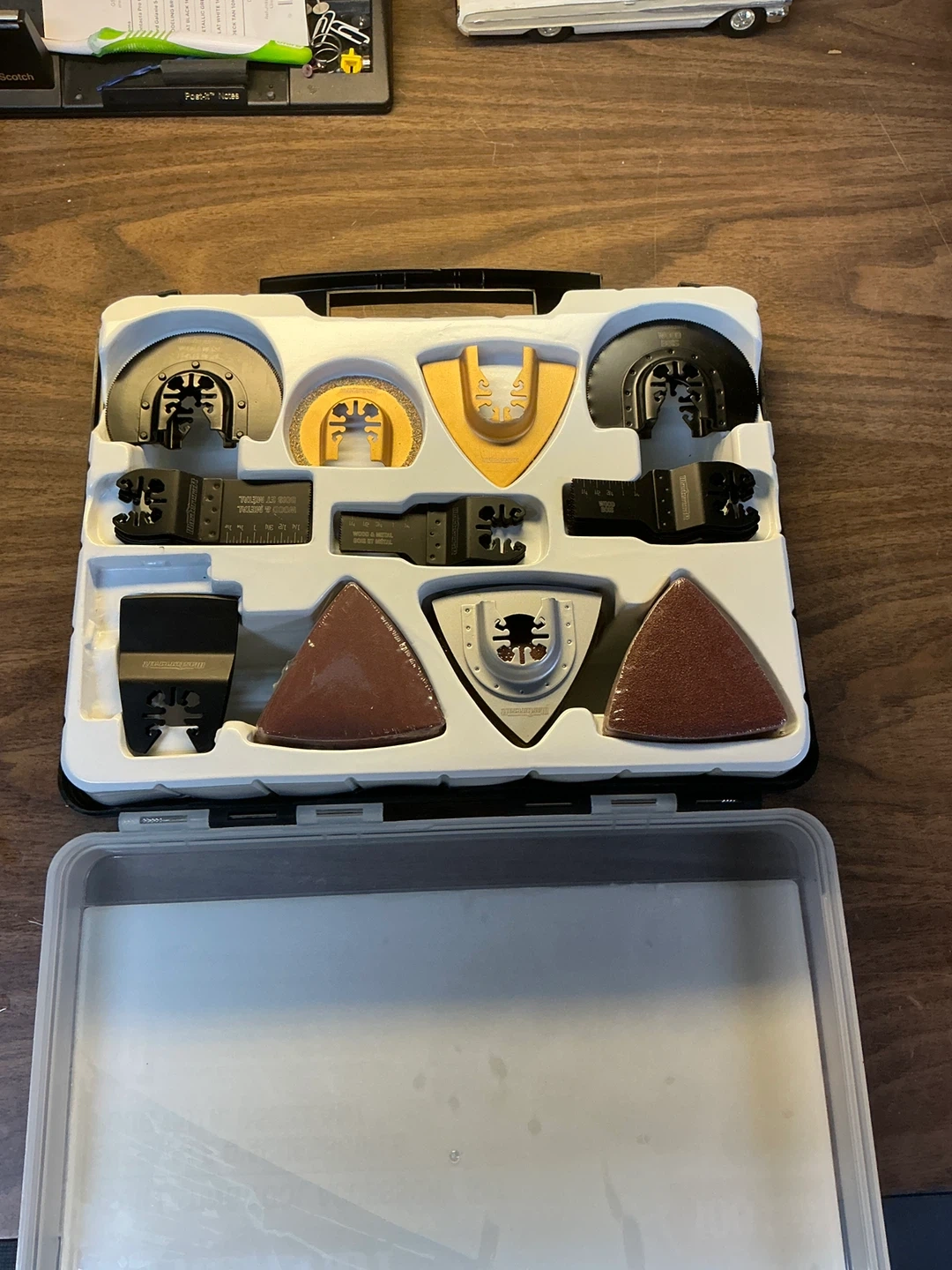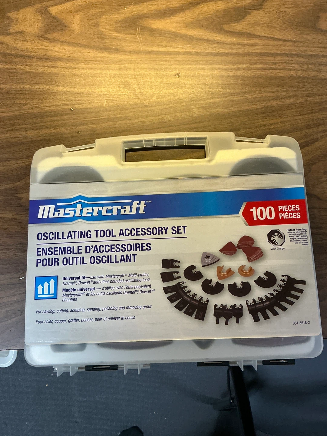 This is a 100-piece oscillating tool accessory set from Mastercraft. It includes various blades and sandpaper attachments for sawing, cutting, scraping, sanding, polishing, and removing grout. Universal fit design works with Mastercraft, Multi-Cutter, Dremel, DeWalt, and other oscillating tools.