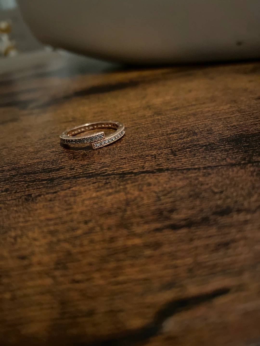 This ring has a gold-tone finish and is adorned with small clear and blue stones. It's designed in an open, crossover style. Great for adding a touch of sparkle to any outfit!