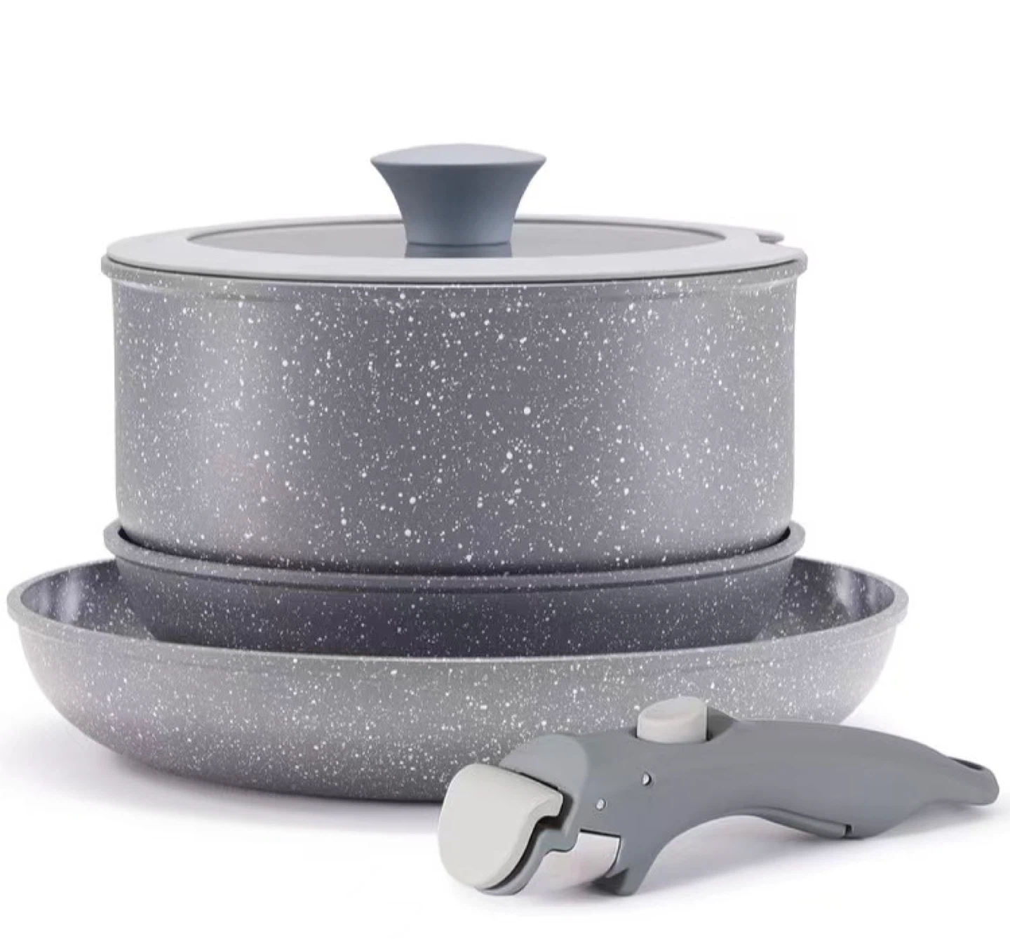Gray Non Stick Pot and Pan Set with Removable Handle, Ceramic Cookware Set Detachable Handle, 5pcs Induction Kitchen Camping Stackable Pots Pans, Dishwasher/Oven Safe, PTFE/PFAS/PFOA Free
