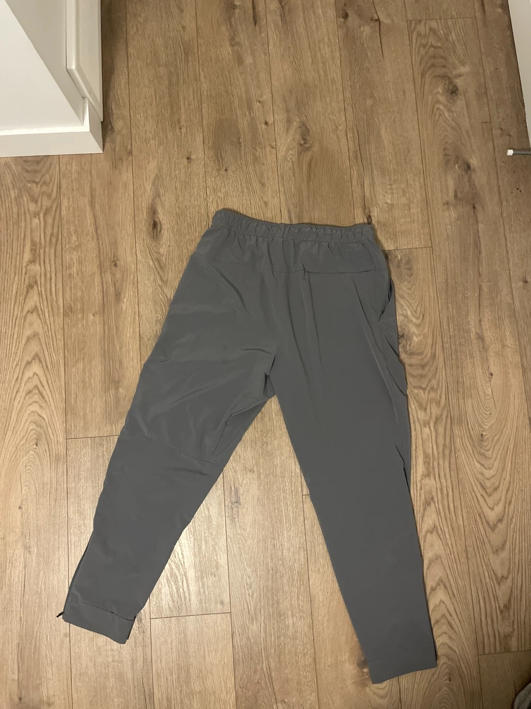 These are Nike Dri-FIT athletic pants in a versatile grey colour. They're made in Thailand and feature a drawstring waist for a comfortable fit. The pants are size Large.