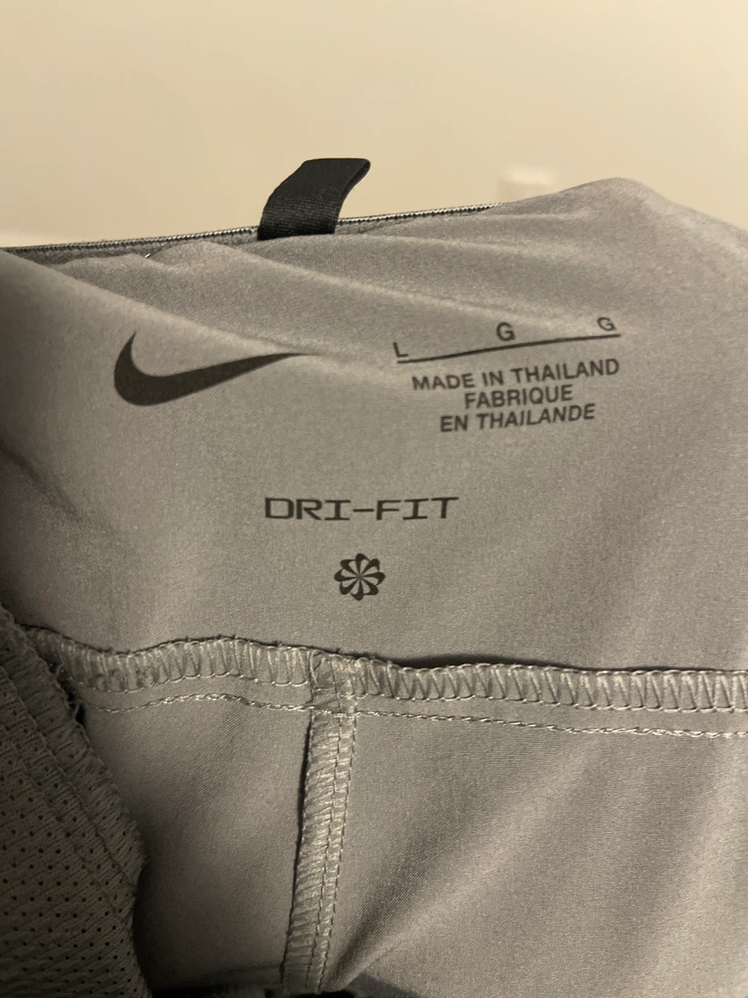 These are Nike Dri-FIT athletic pants in a versatile grey colour. They're made in Thailand and feature a drawstring waist for a comfortable fit. The pants are size Large.
