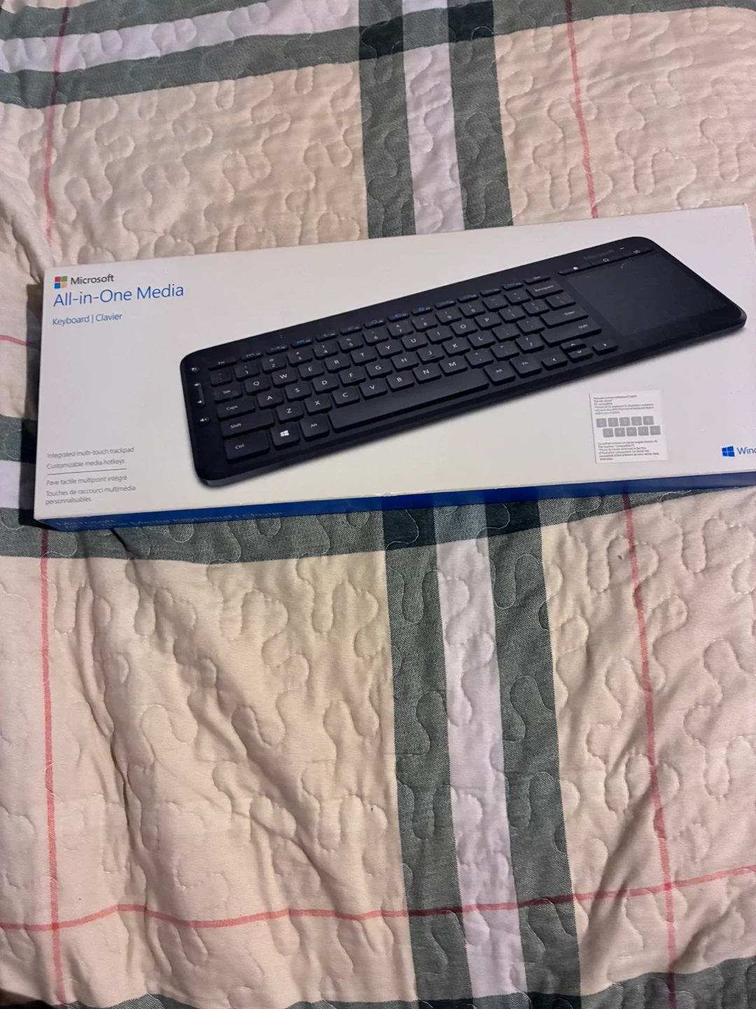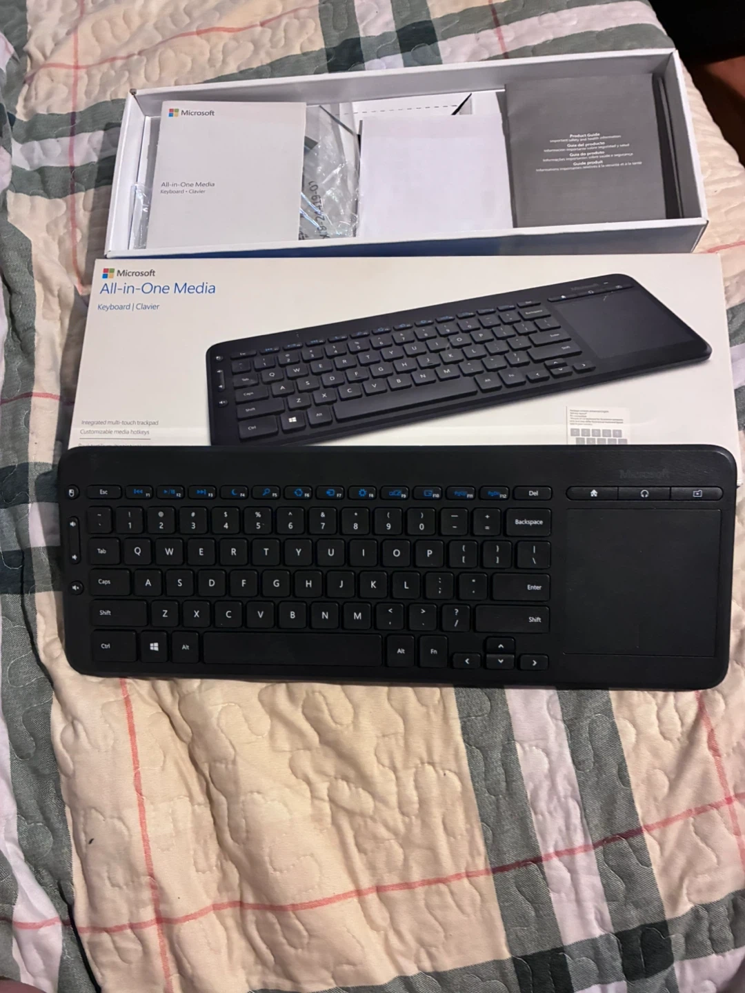 This Microsoft All-in-One Media keyboard has an integrated multi-touch trackpad. It's designed for custom media keys and includes a full-size key layout. This keyboard is great for home entertainment setups!