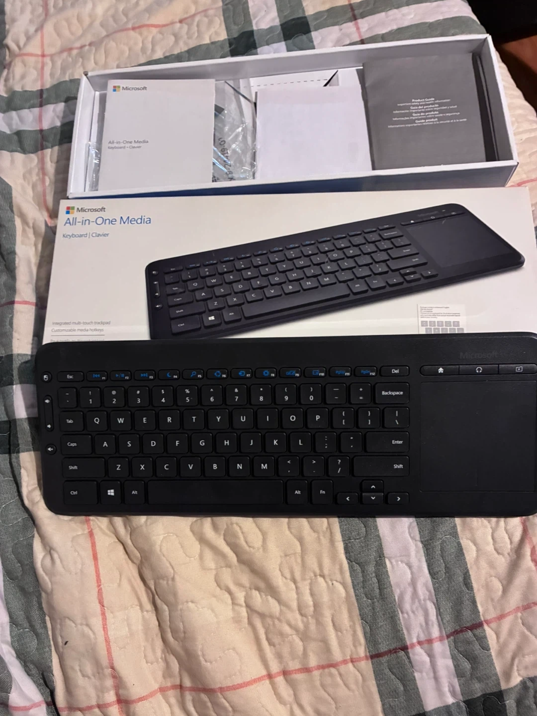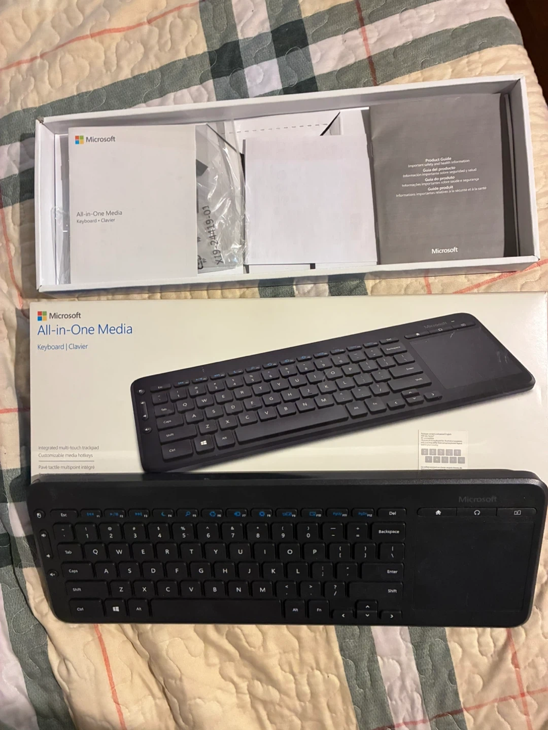 This Microsoft All-in-One Media keyboard has an integrated multi-touch trackpad. It's designed for custom media keys and includes a full-size key layout. This keyboard is great for home entertainment setups!