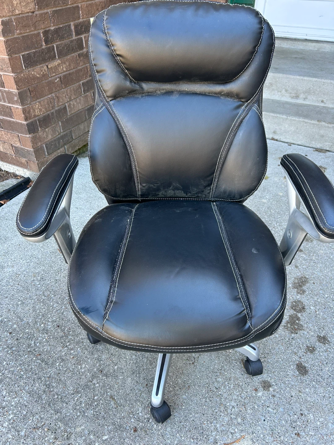 This is a black faux leather office chair with white stitching. It has a sturdy metal base with wheels for easy mobility. Some wear is visible on the seat and backrest.