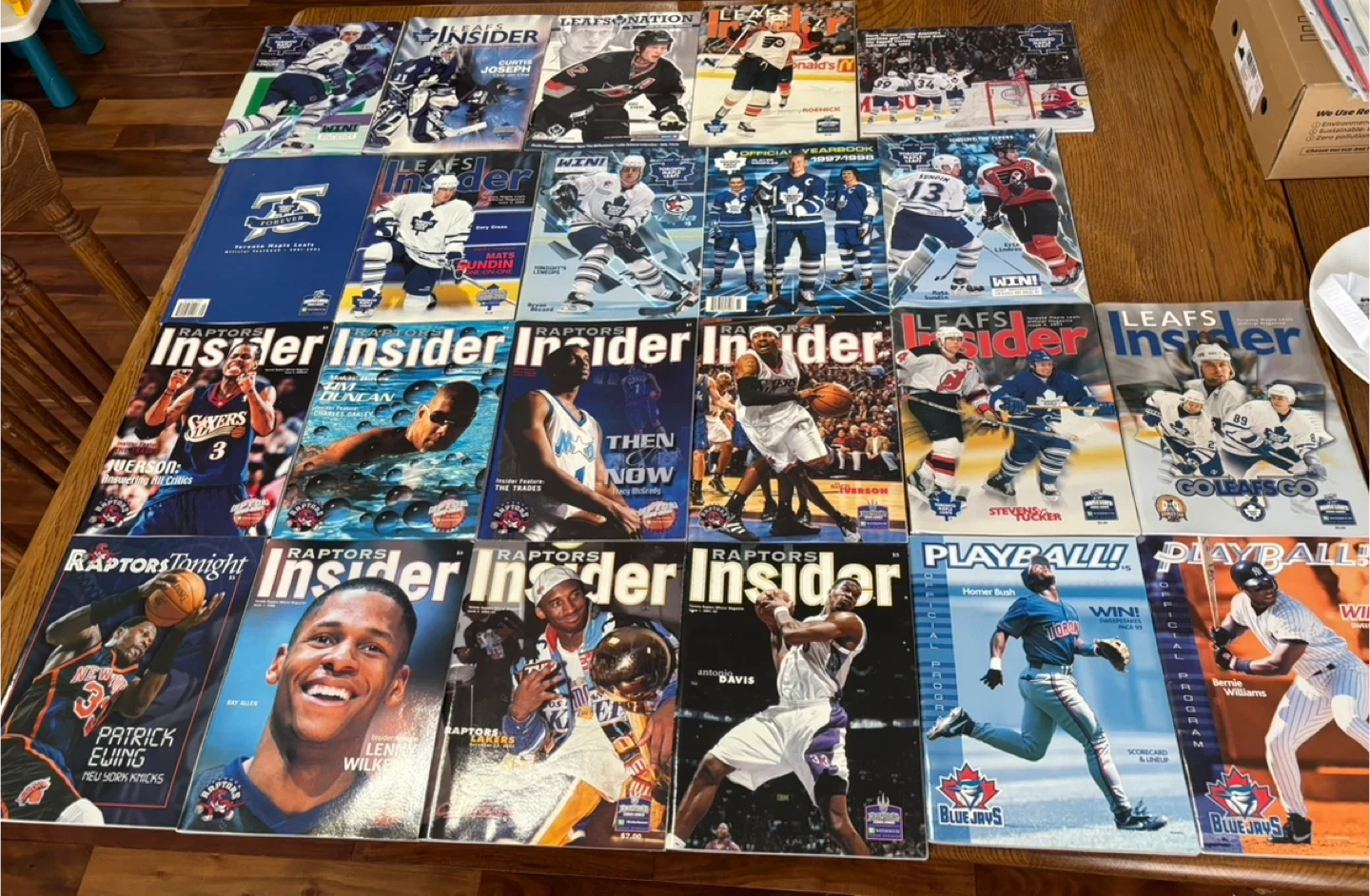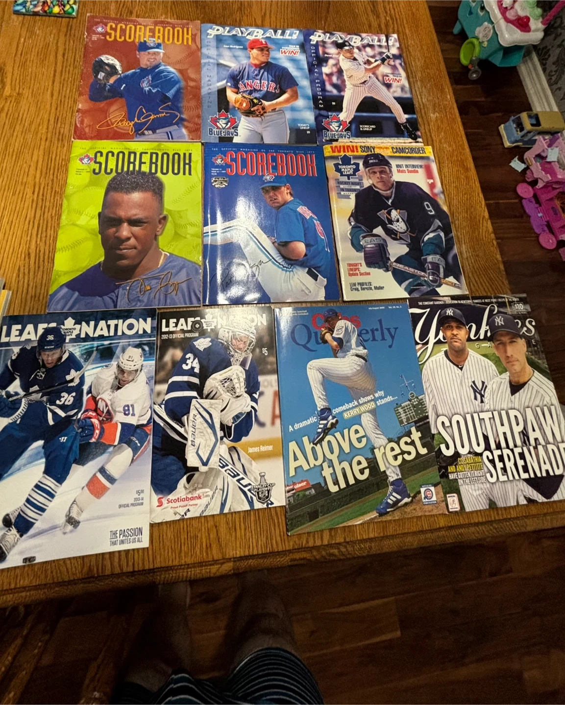 This lot includes a variety of sports magazines and scorebooks featuring hockey and baseball. Brands visible include Raptors Insider, Leafs Nation, and Scorebook.
