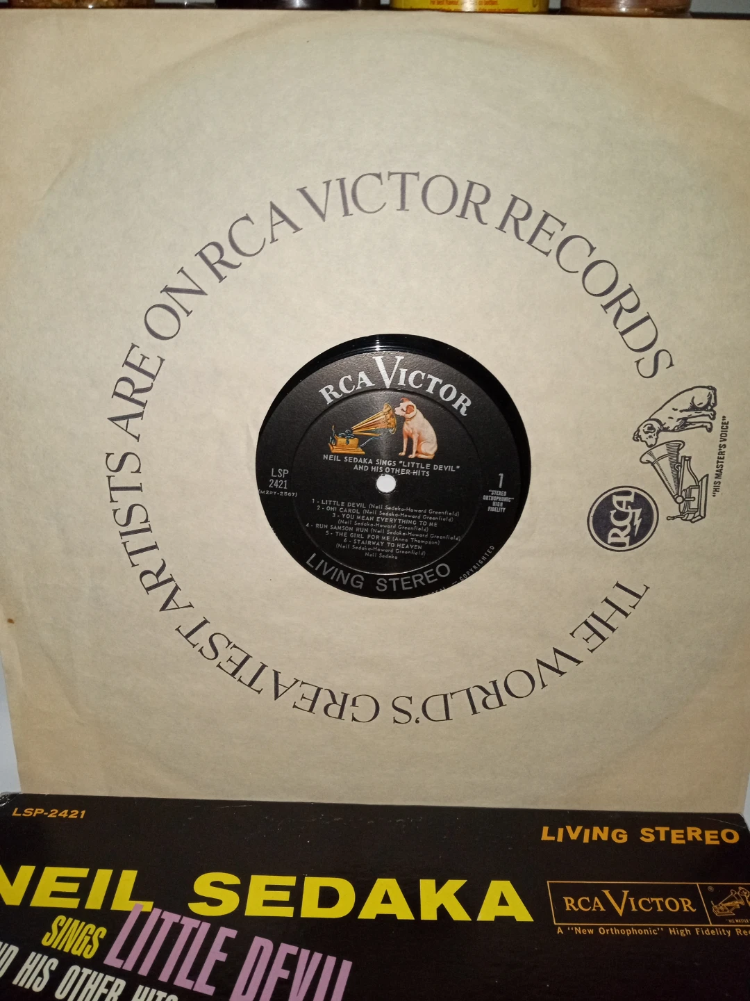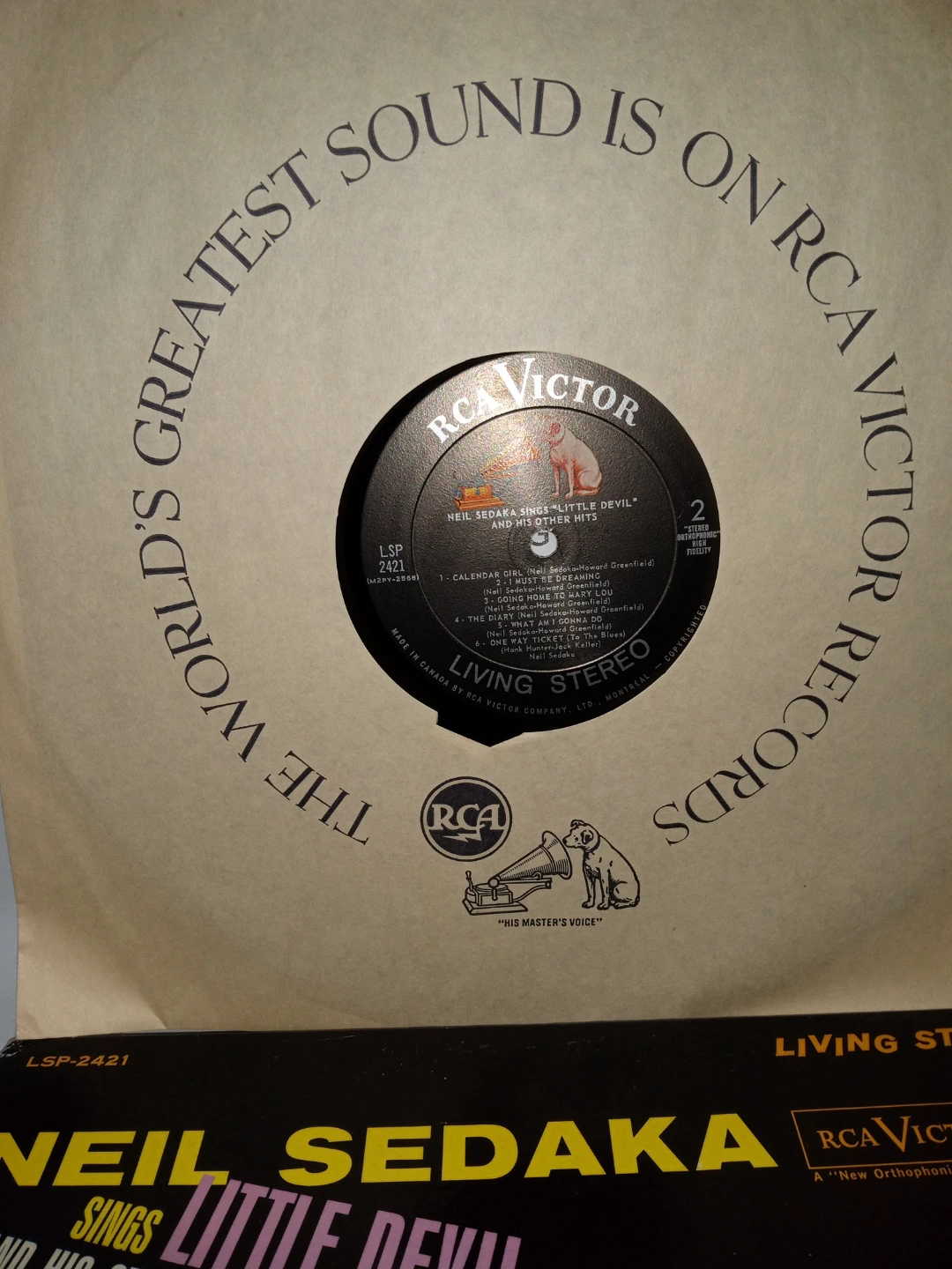 This is a vinyl record featuring Neil Sedaka's album 'Little Devil and His Other Hits'. It includes tracks like 'Little Devil', 'Oh Carol', and 'Stairway to Heaven'. The record is on the RCA Victor label and plays in Living Stereo. Near Mint Condition 1961 Original Canadian Pressing.