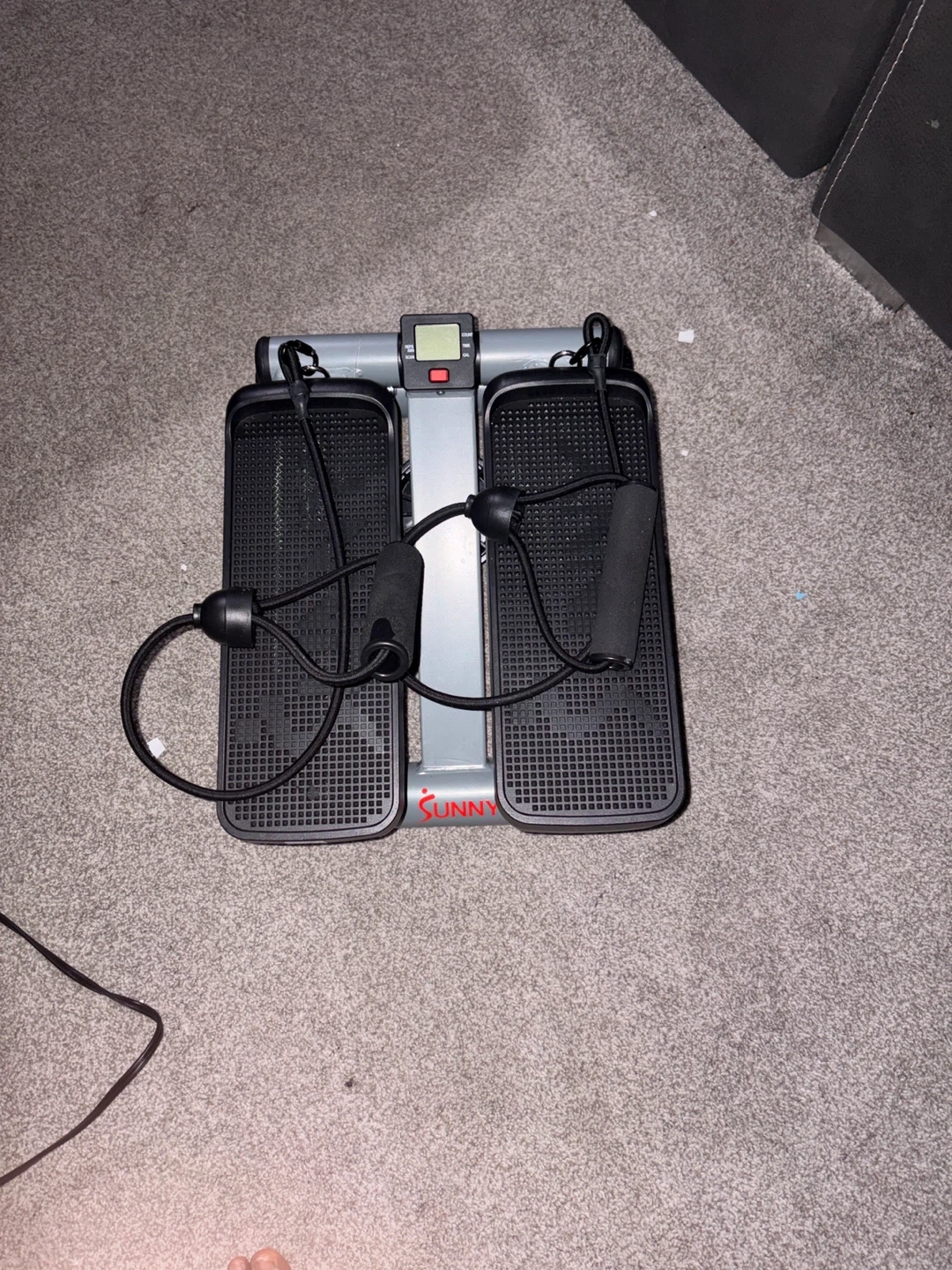 Compact mini stepper with resistance bands for a full-body workout. Features a digital display to track steps, time, and calories. This stepper is designed for convenient home use and helps improve cardio fitness. Great for a quick workout anytime!