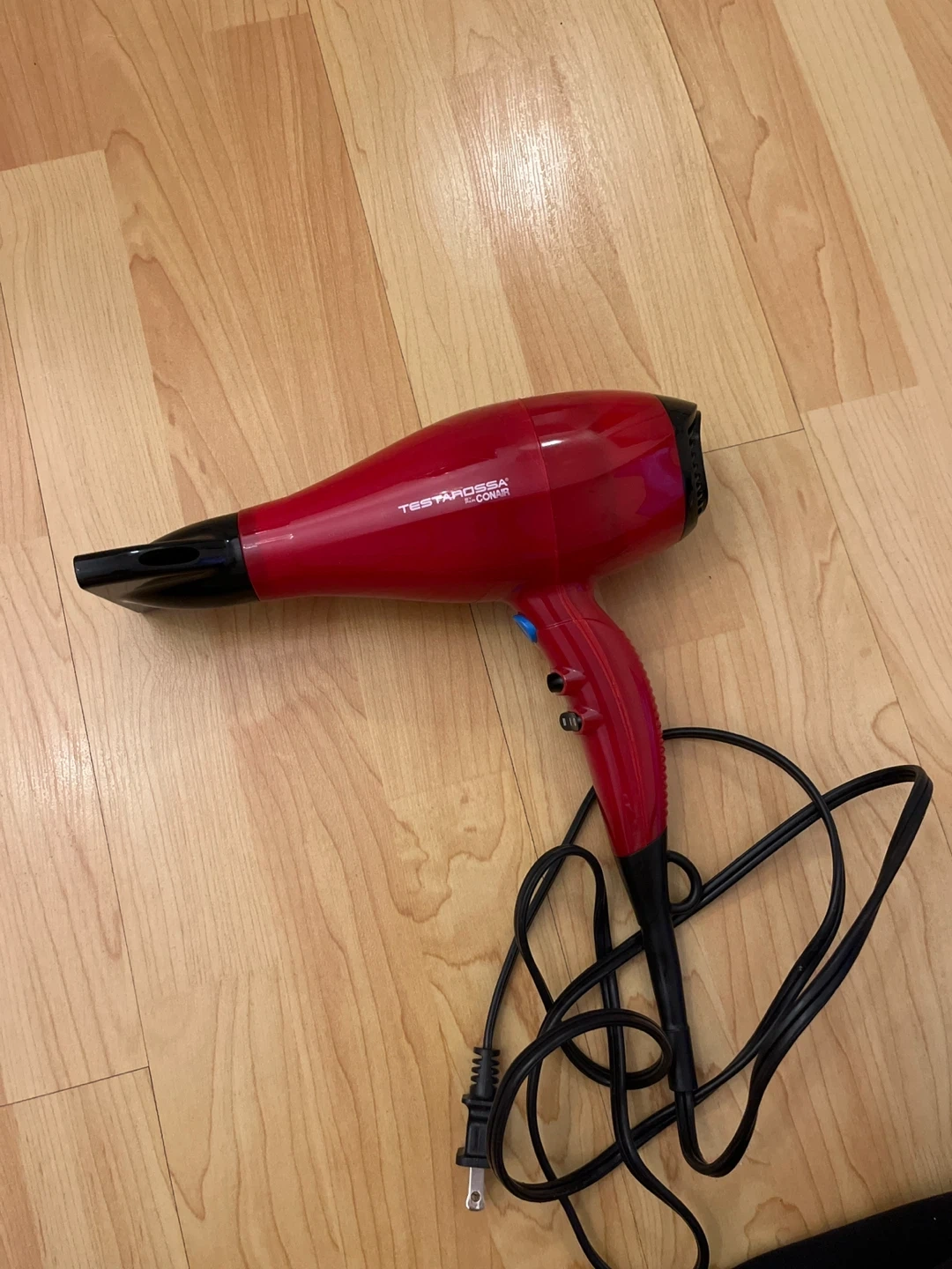 This is a red Conair Testarossa hair dryer. It features multiple heat and speed settings. This dryer is great for quick styling and everyday use!