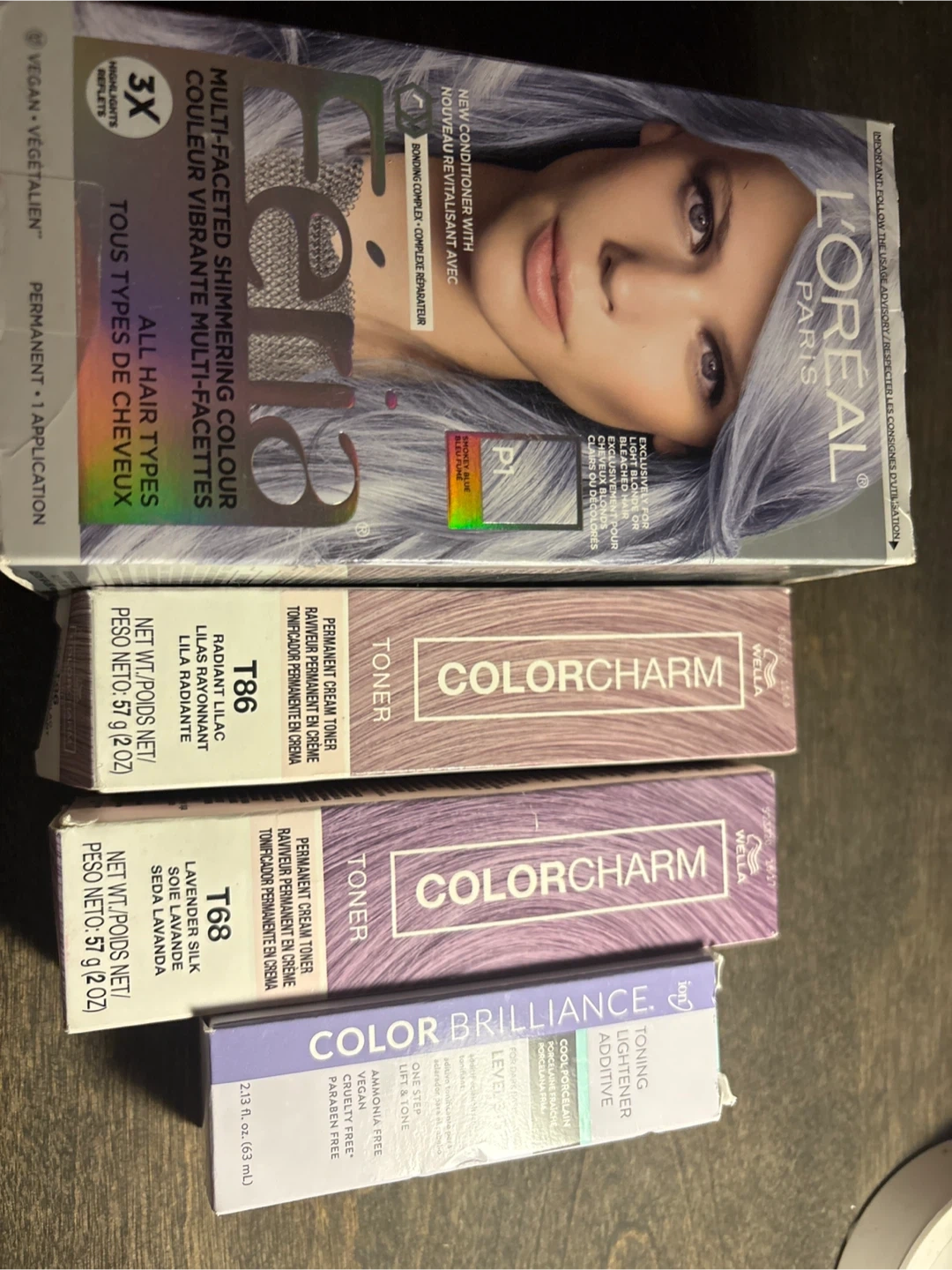 This lot includes L'Oréal Féria multi-faceted shimmering colour in 'Smokey Blue P1' and two Wella ColorCharm toners, T86 'Radiant Lilac' and T68 'Lavender Silk'. A Color Brilliance toning lightener additive is also included. These products are for permanent hair colouring and toning.