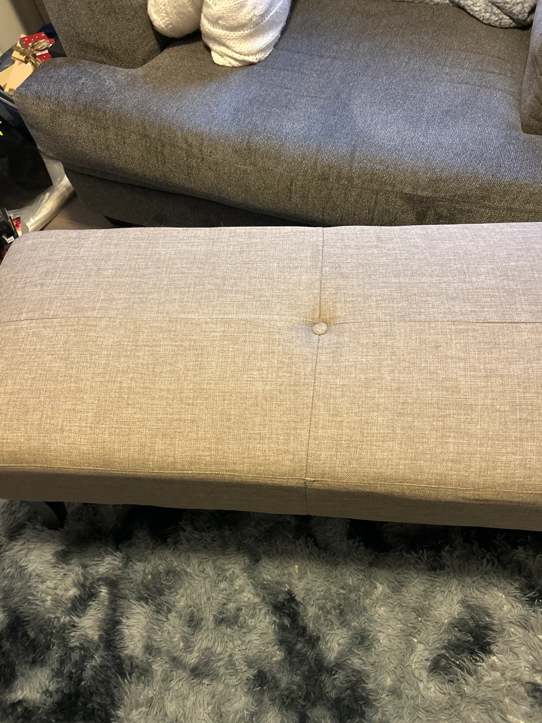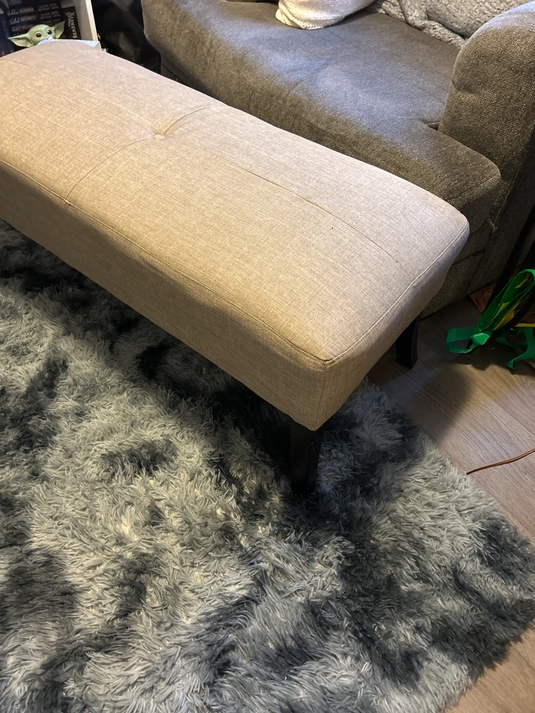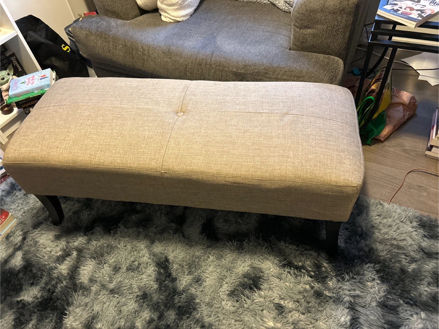 This is a beige upholstered ottoman bench. It has a button tufted top and dark wooden legs. It's suitable for use as an accent piece or for extra seating.