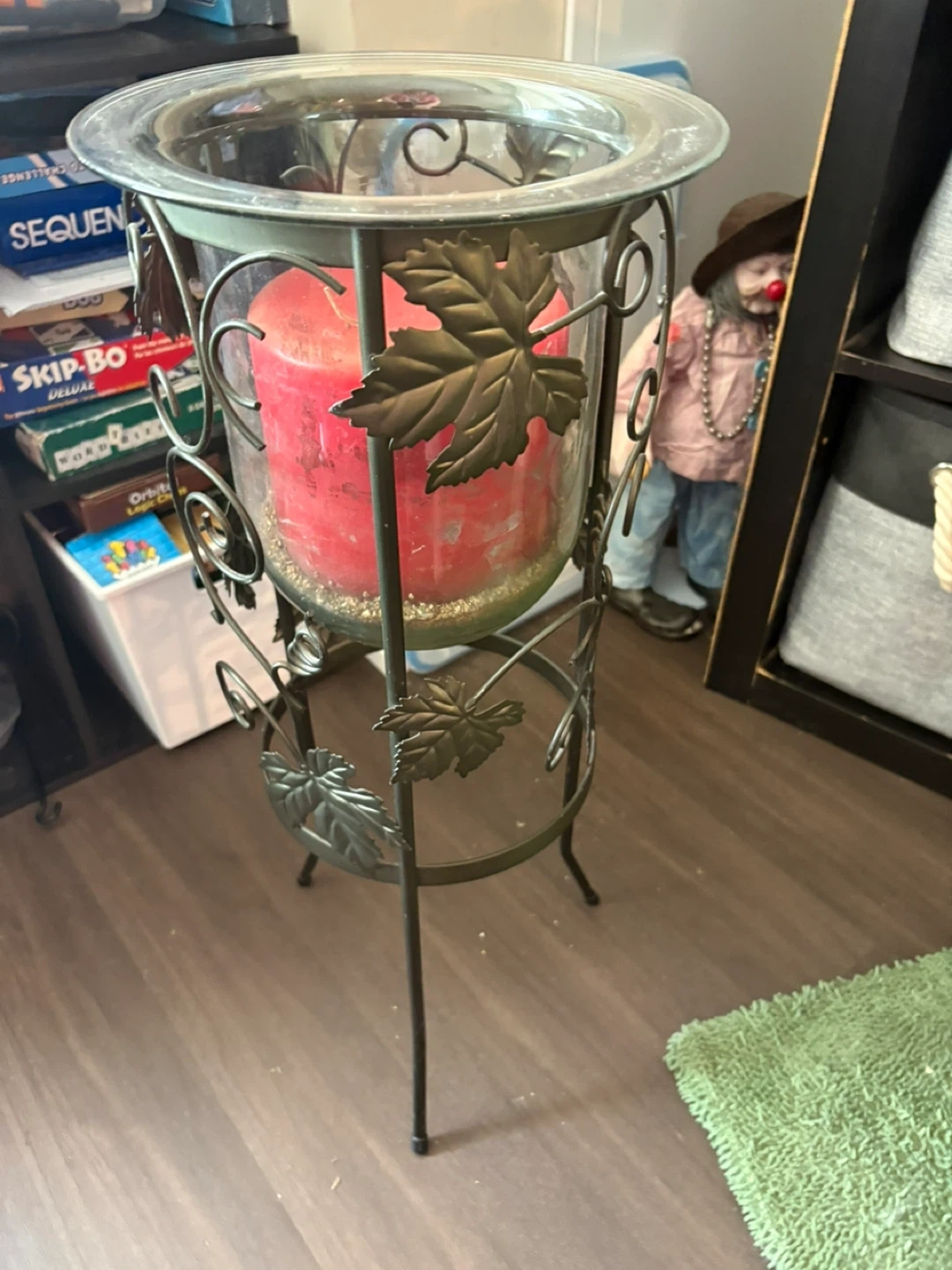 This decorative candle holder features a glass cylinder with a metal stand adorned with leaf motifs. It comes with a large red 3 wick pillar candle inside, complete with a decorative filling at the base. This piece would look lovely in any decor. It is 25 1/2 inches tall with a 10.5 inch circumference at the top of the glass cylinder. This is a partylite original the candle has never been lit.