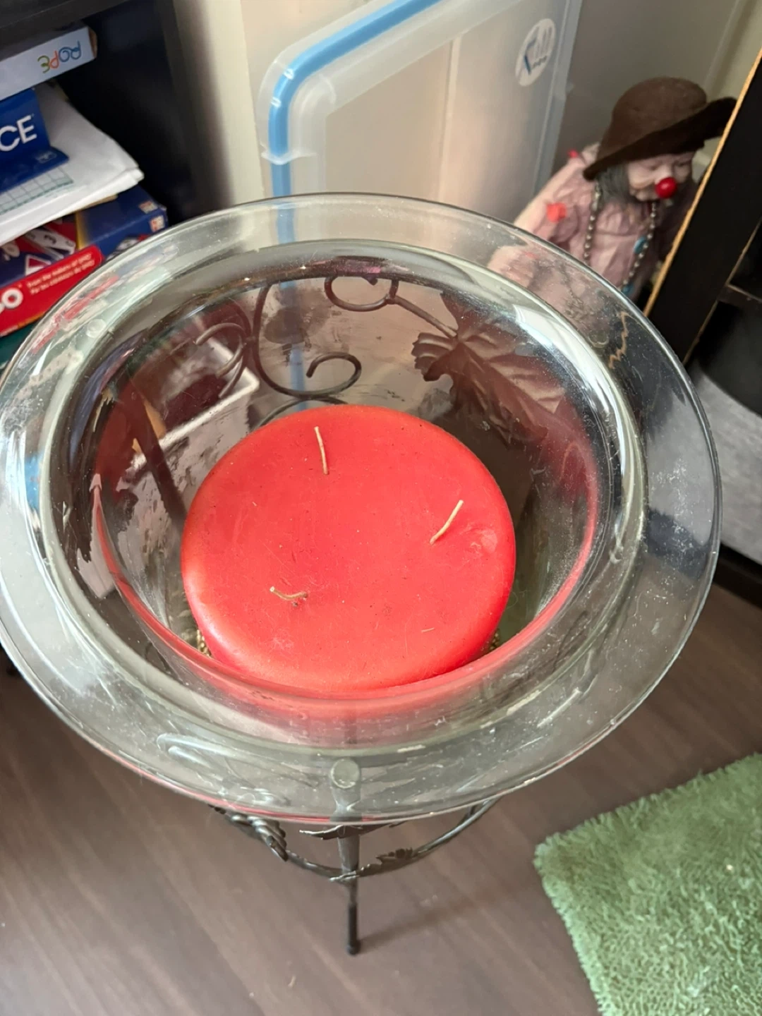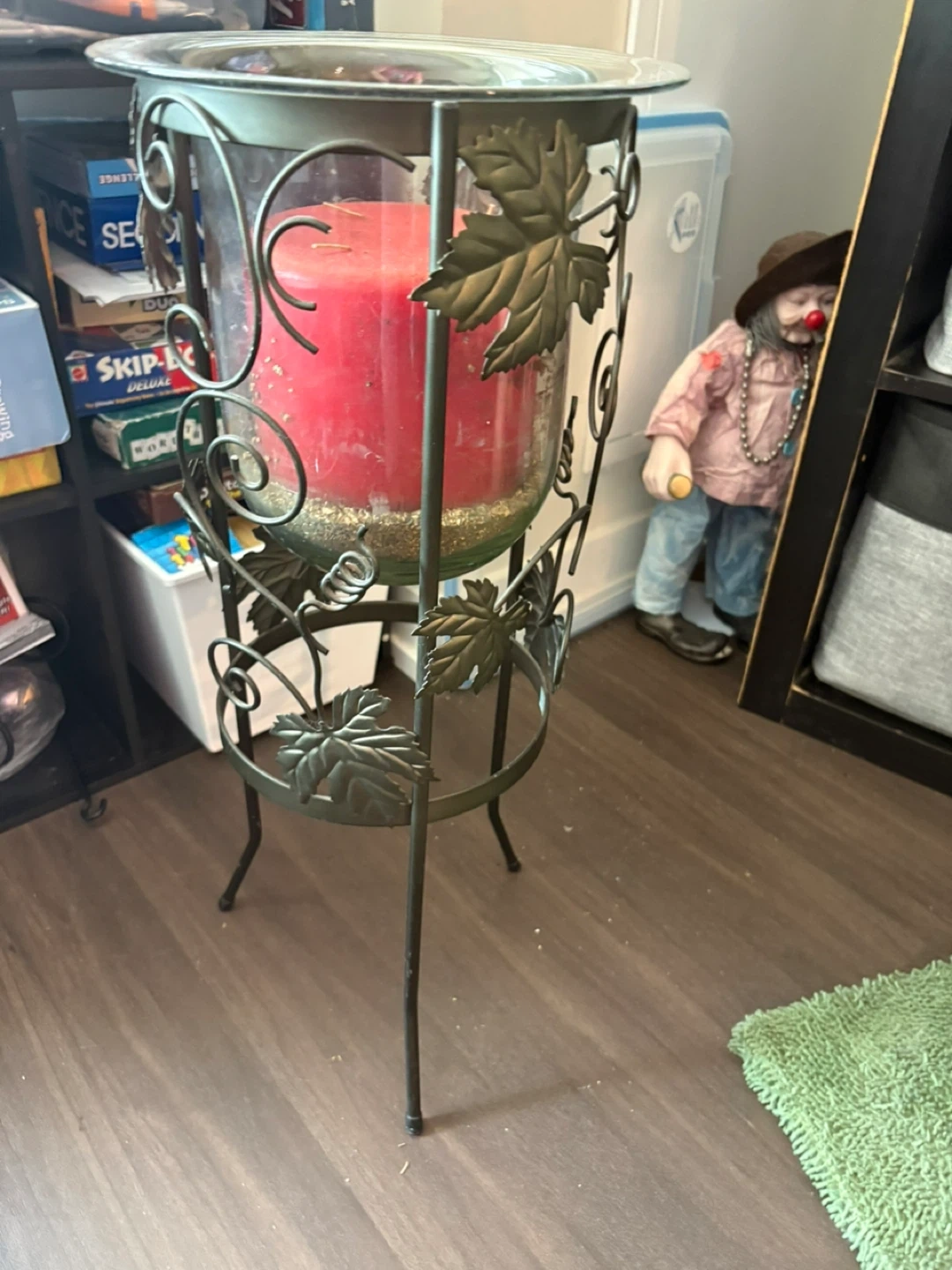 This decorative candle holder features a glass cylinder with a metal stand adorned with leaf motifs. It comes with a large red 3 wick pillar candle inside, complete with a decorative filling at the base. This piece would look lovely in any decor. It is 25 1/2 inches tall with a 10.5 inch circumference at the top of the glass cylinder. This is a partylite original the candle has never been lit.