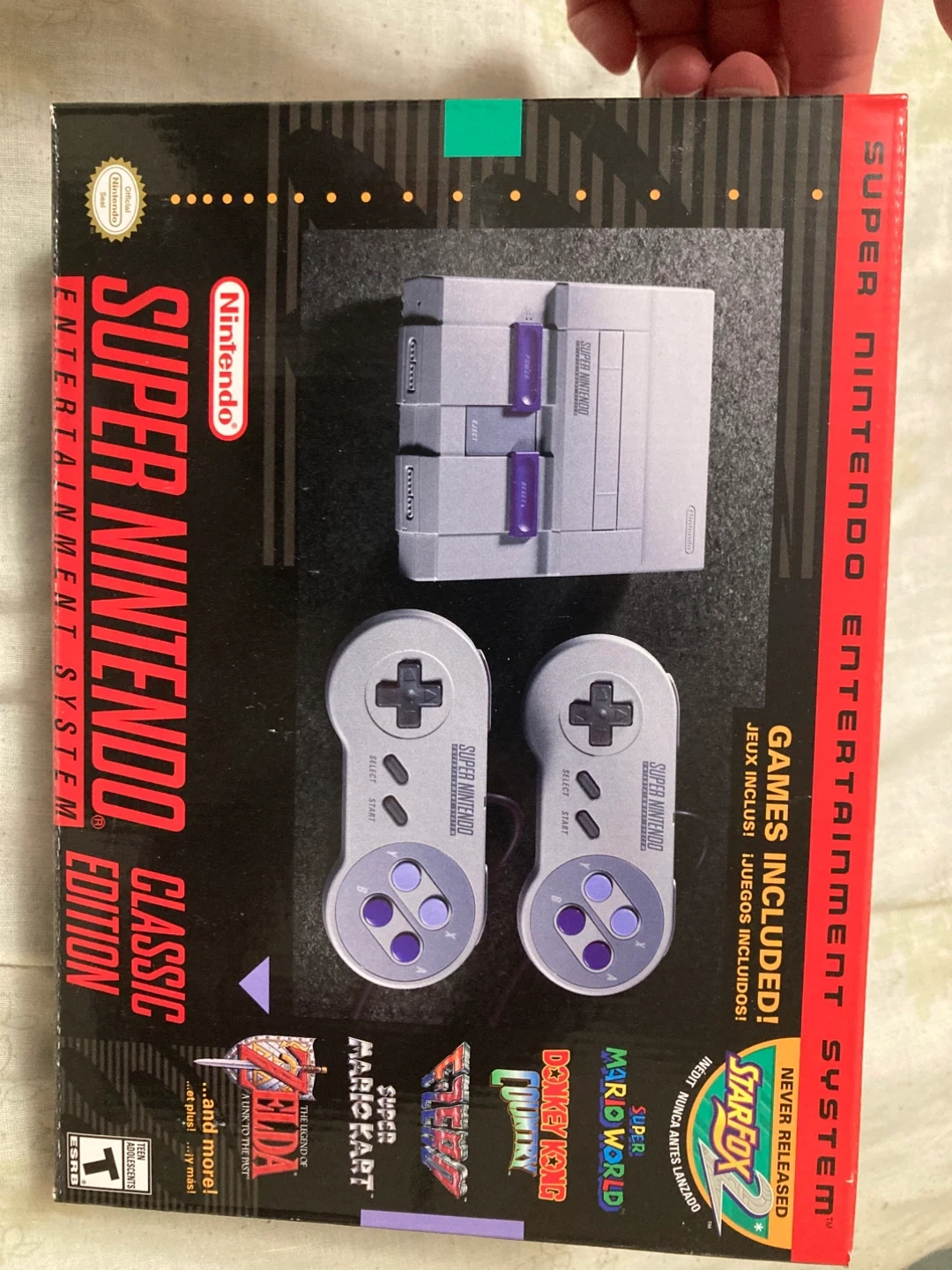 Brand new! This is the Super Nintendo Entertainment System Classic mini Edition. It comes with two controllers and includes a variety of classic games built-in. It's a great way to revisit favourite retro titles!