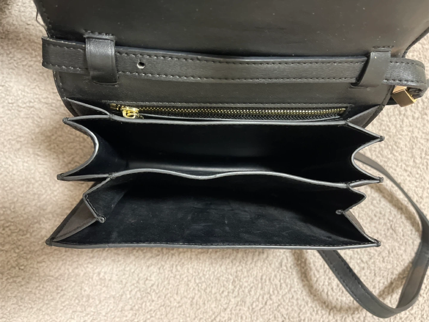 This is a black shoulder bag with a textured finish. It features a gold-toned clasp closure on the front flap and a zippered interior pocket. The interior has multiple compartments for organization.