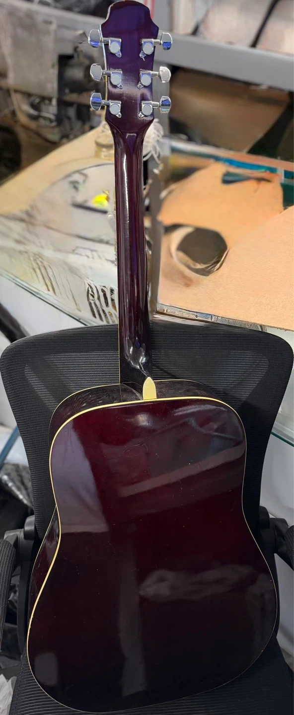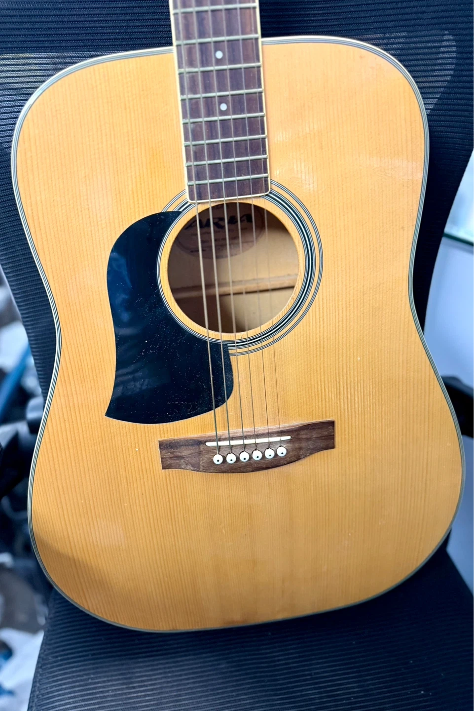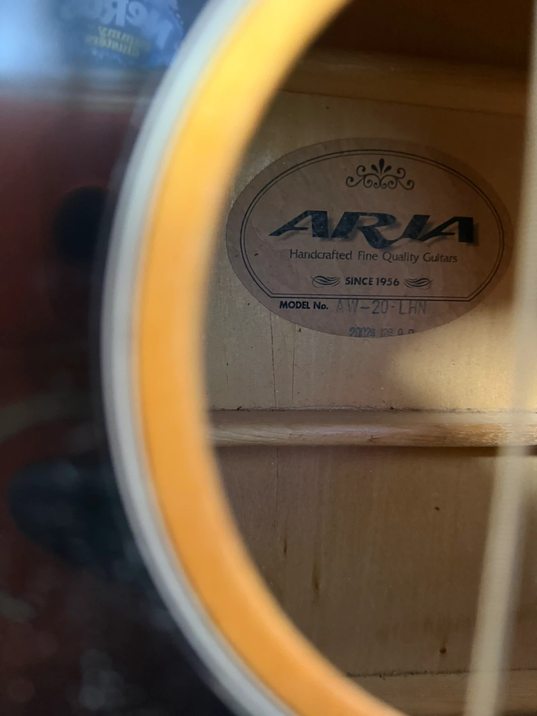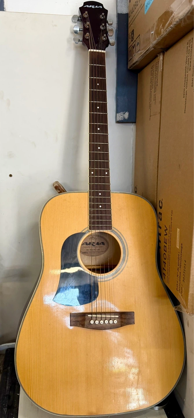 An Aria acoustic guitar, model AW-20 LHN. Handcrafted fine quality guitars since 1956. It features a natural wood finish and a black pickguard. Perfect for beginner musicians looking for a reliable instrument.