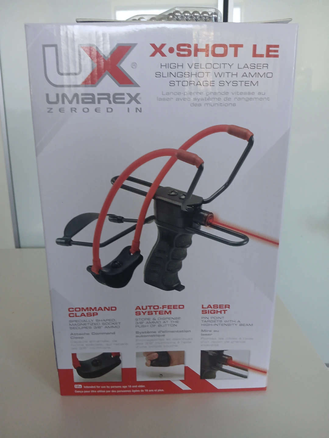 Umarex X-Shot LE slingshot with laser sight and auto-feed system. Includes a command clasp and adjustable arm brace. Comes with 250pc 3/4" steel ammo balls.