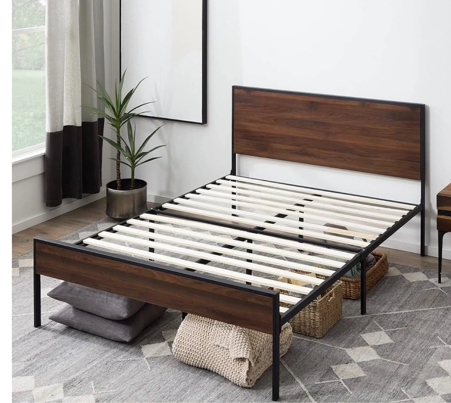 Metal bed frame with a dark wood-look headboard and platform support. Slats included for mattress. Easy to assemble and provides a sturdy base.