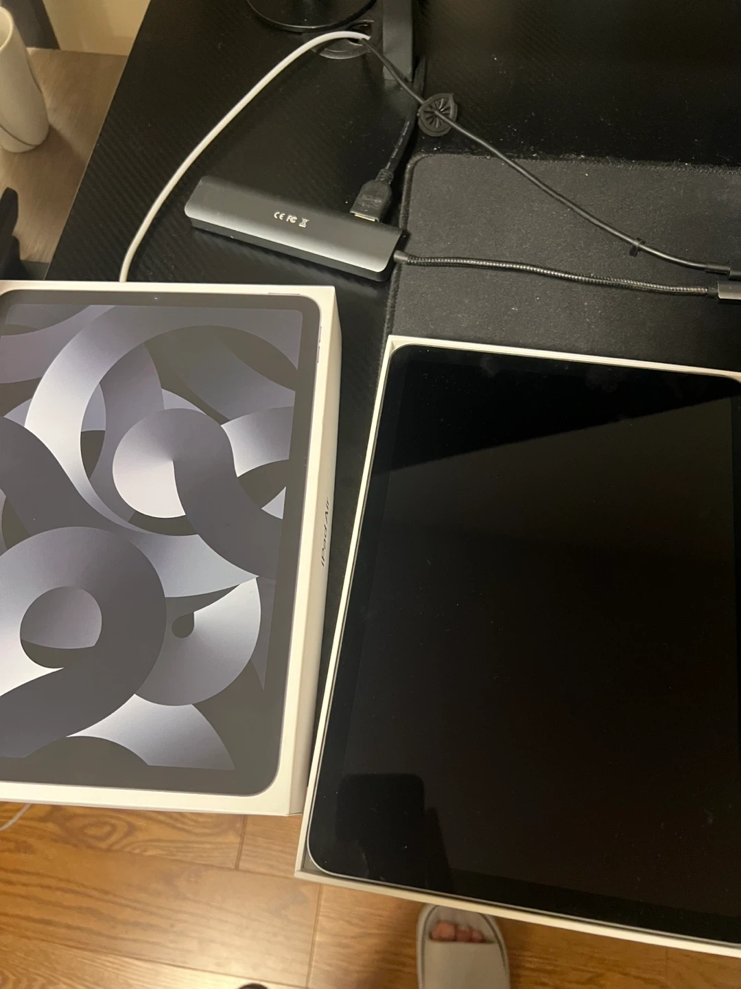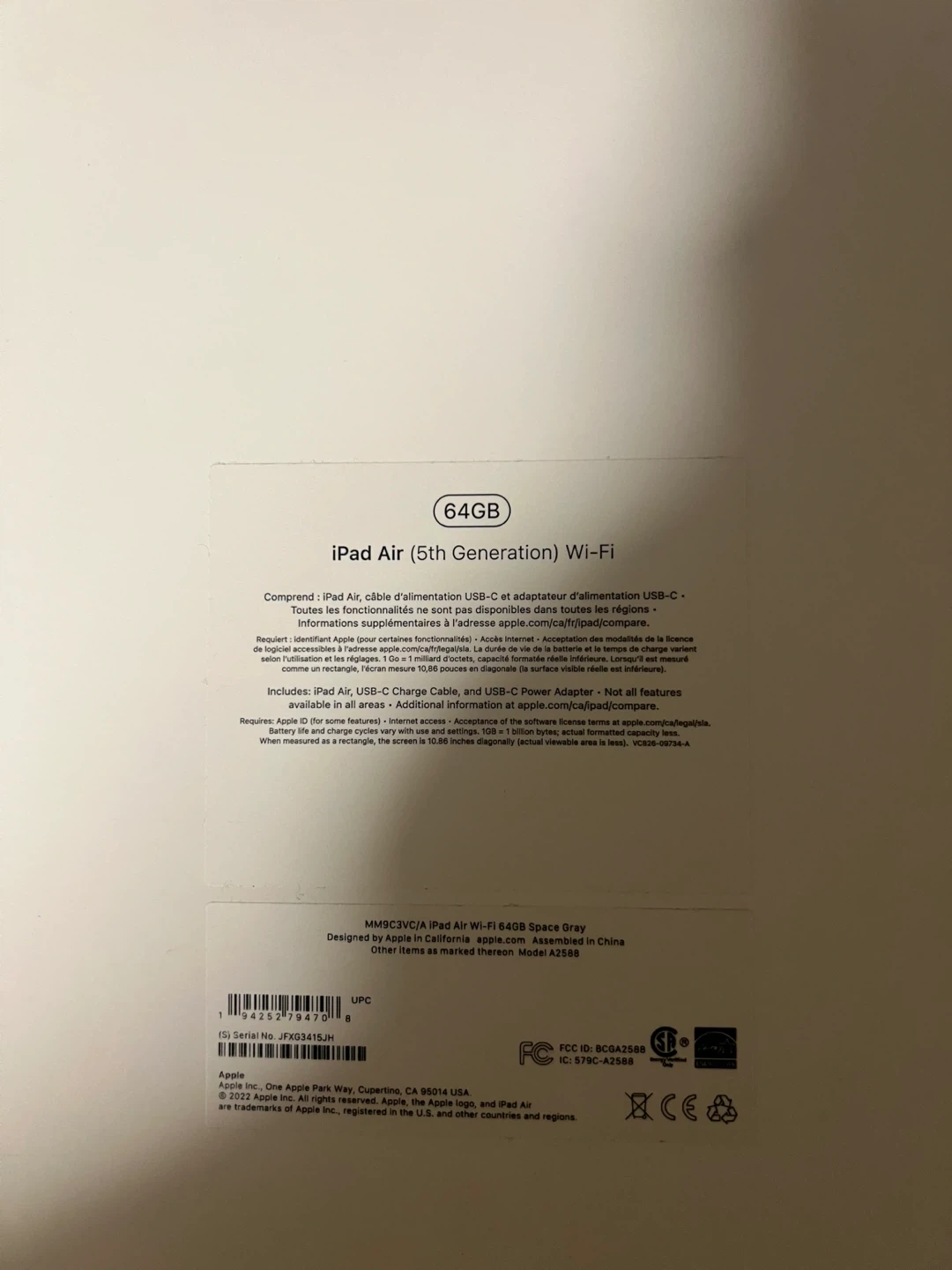 Selling an Apple iPad Air (5th Generation) in Space Gray with 64GB of storage. It's in great condition and comes with the original box. Includes a USB-C cable and USB Power Adapter. Model number is MM9C3VC/A.
