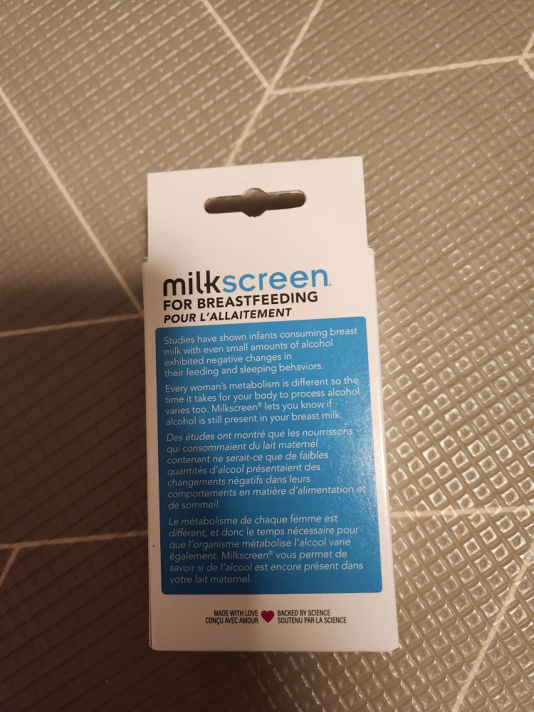 UpSpring MilkScreen helps detect alcohol in breast milk. Results are available in 2 minutes. This box contains 20 test strips.
