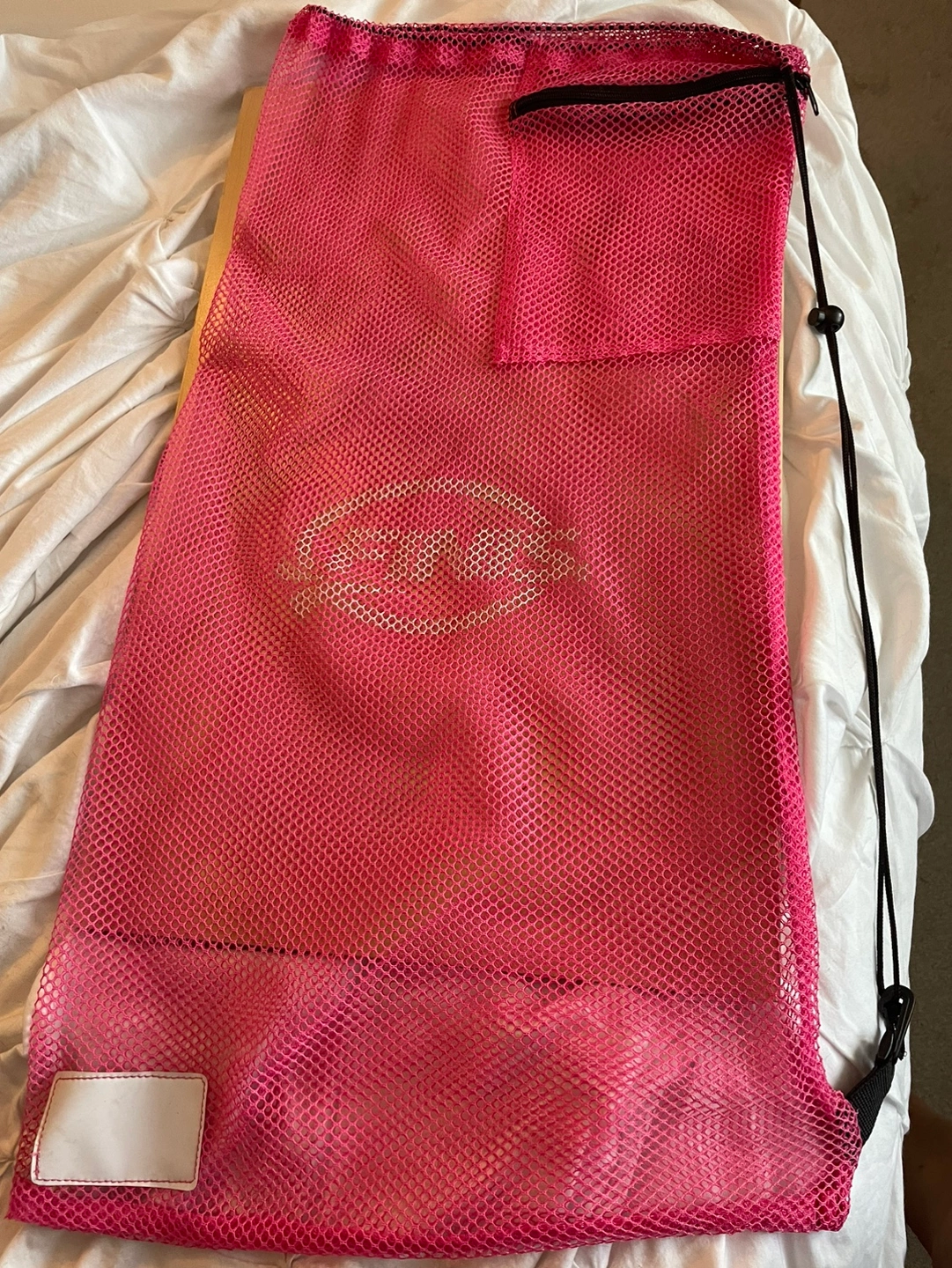 Large mesh swim bag, with draw string & exterior zipper pocket