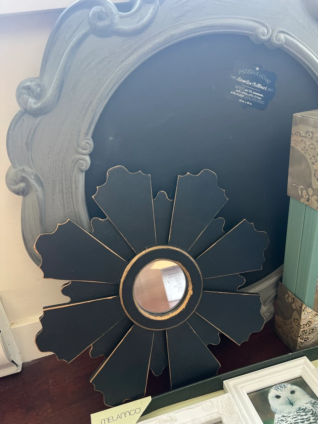 A collection of decorative photo frames and mirrors in various styles. Includes a multi-photo frame from Melamco and a rustic wooden frame. Perfect for adding a personal touch to your home decor. A great way to display cherished memories!