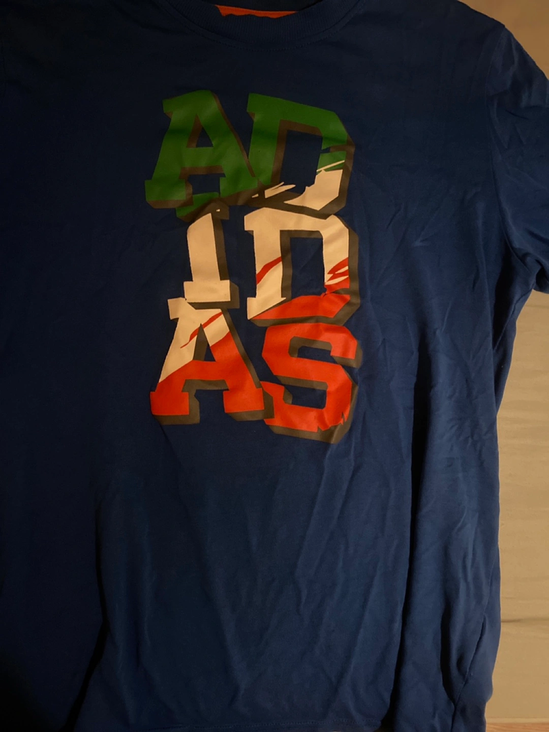 Selling a blue Adidas t-shirt with a cool graphic design on the front! It's in great shape and ready for a new home. Perfect for casual wear or sports activities