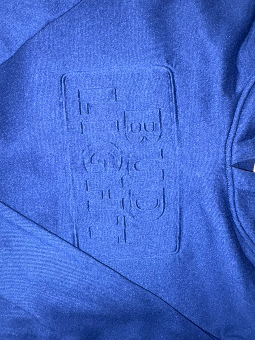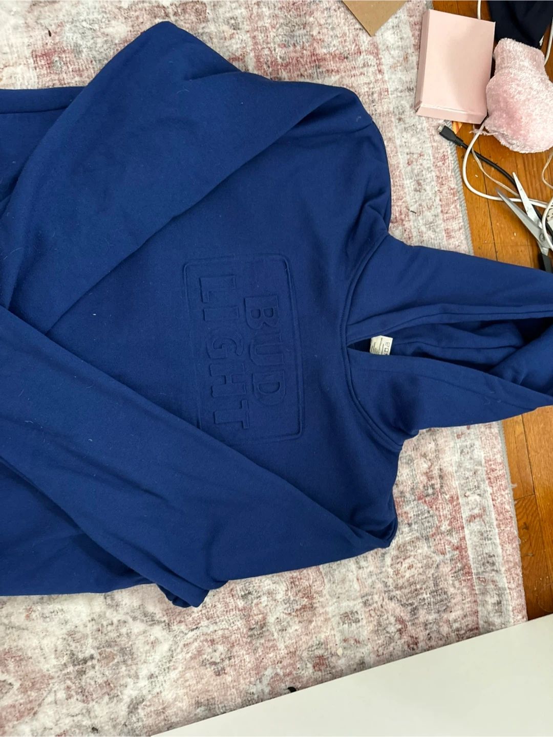I'm selling a Bud Light hoodie in blue. It's in great condition and ready for a new owner! The logo is subtly embossed on the front, giving it a unique look.