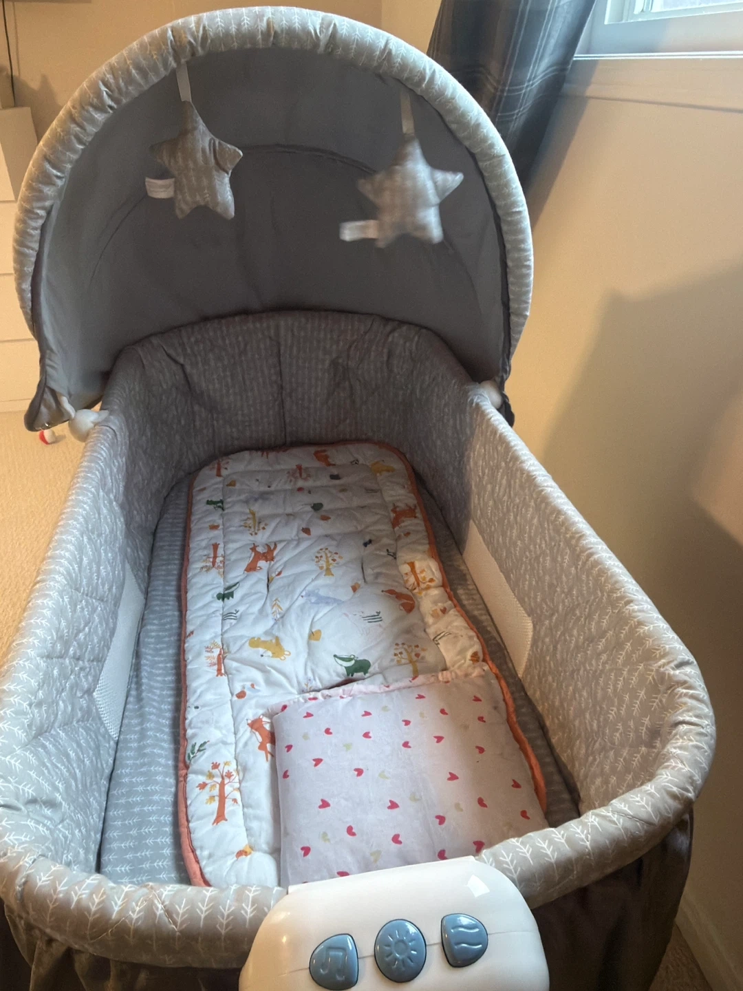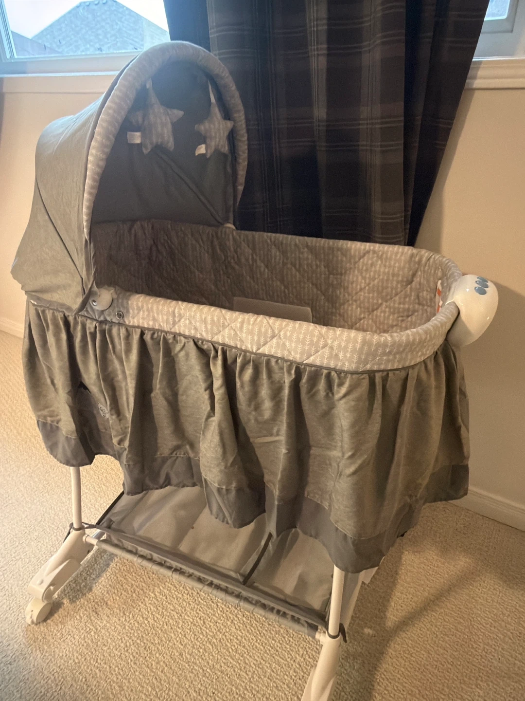 This bassinet features a grey canopy and playful hanging stars. There's also a storage basket underneath for convenience.