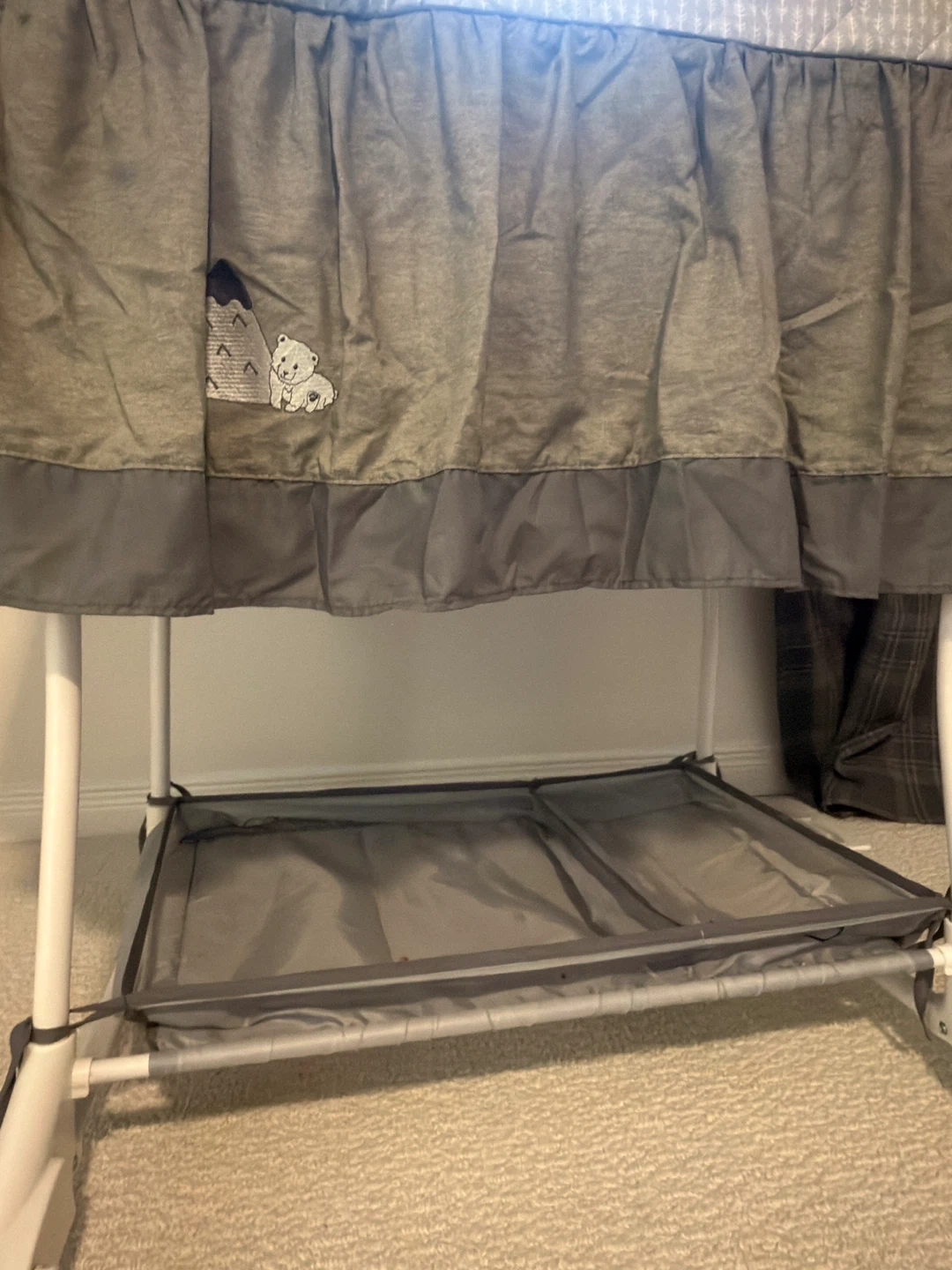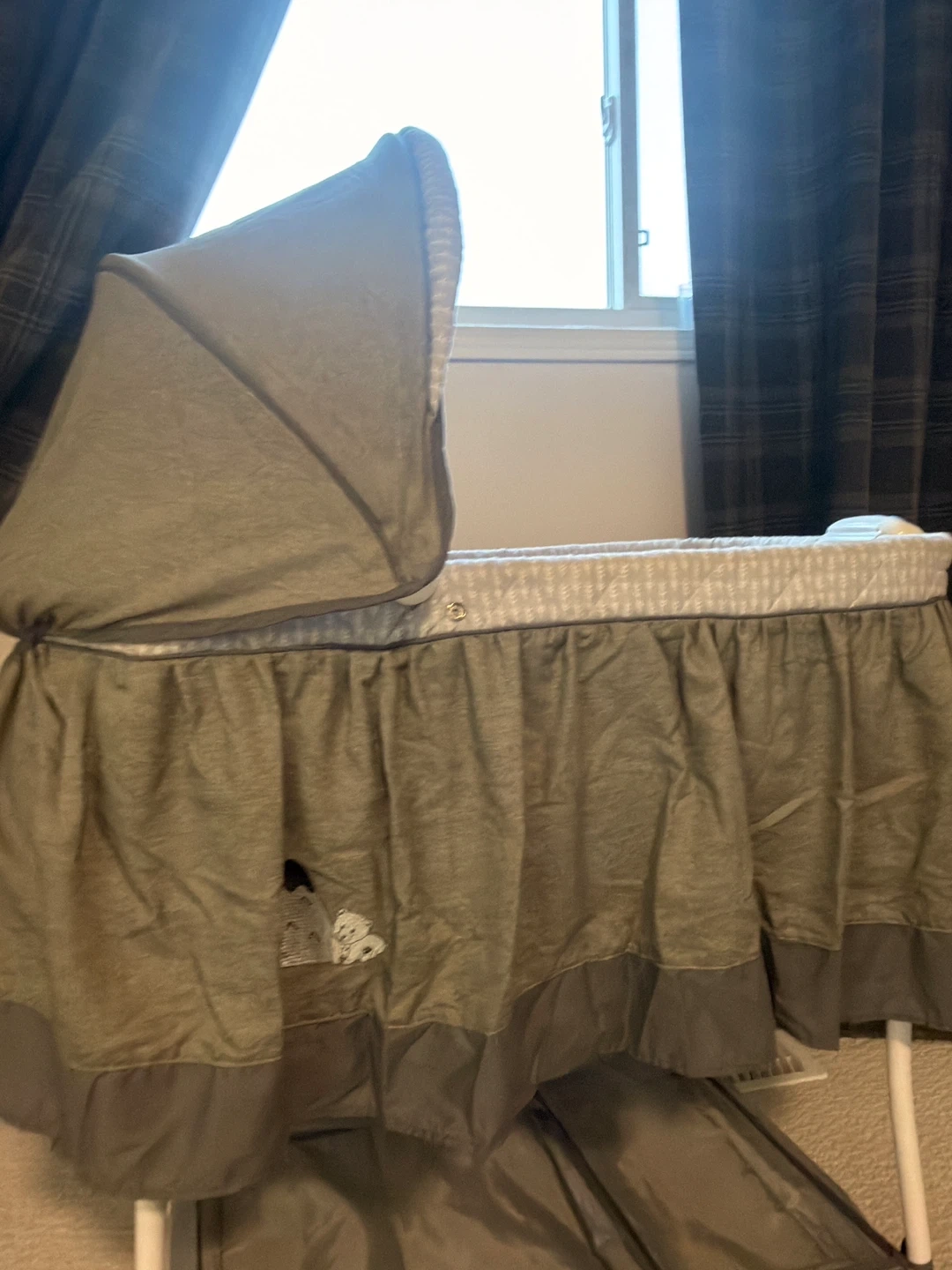 Grey Bassinet with Canopy and toys