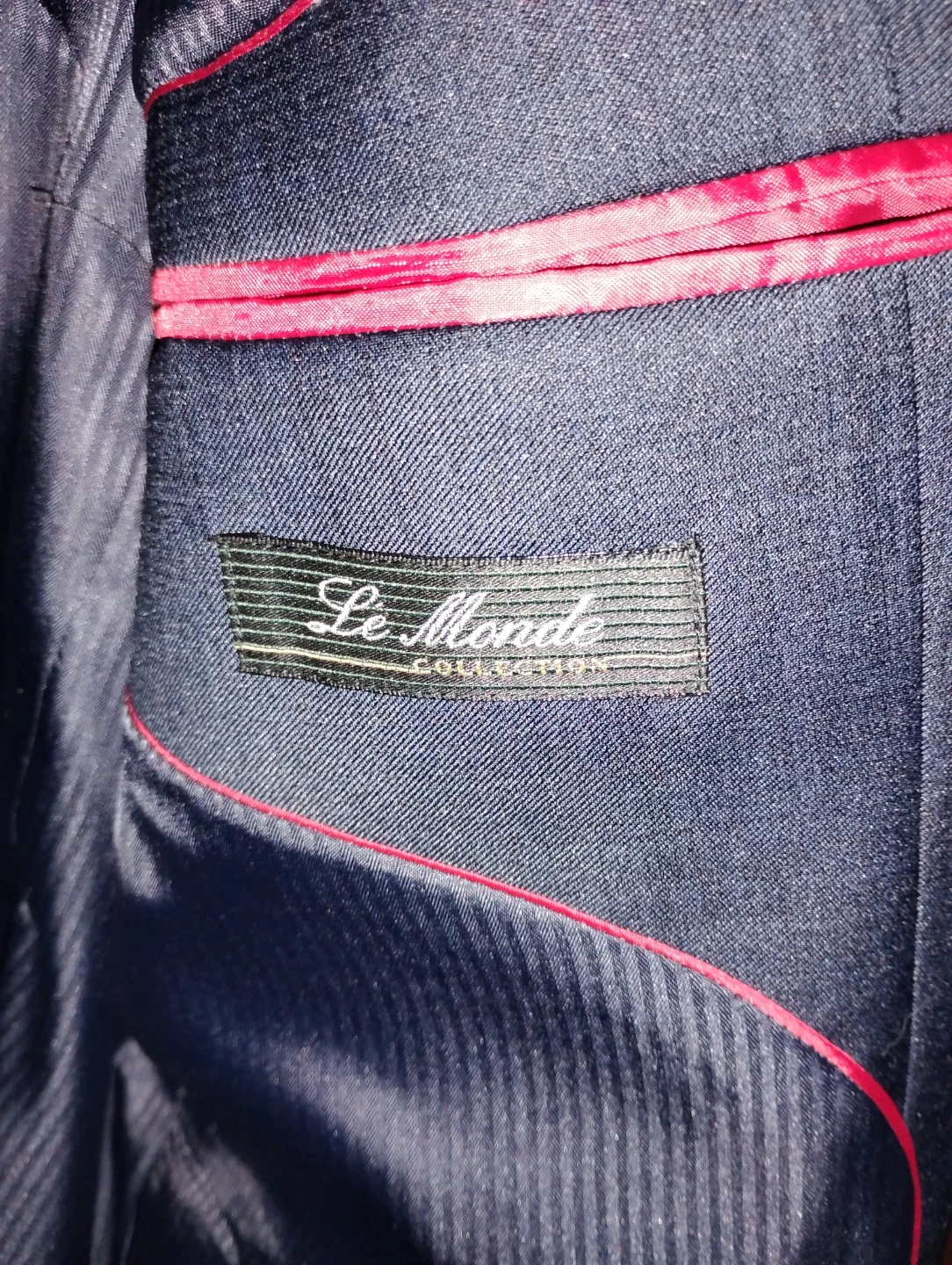 A sharp navy suit jacket from Le Monde Collection. It features a classic two-button closure and a smooth, striped interior lining. This jacket's material appears to be a wool blend, offering a refined look.