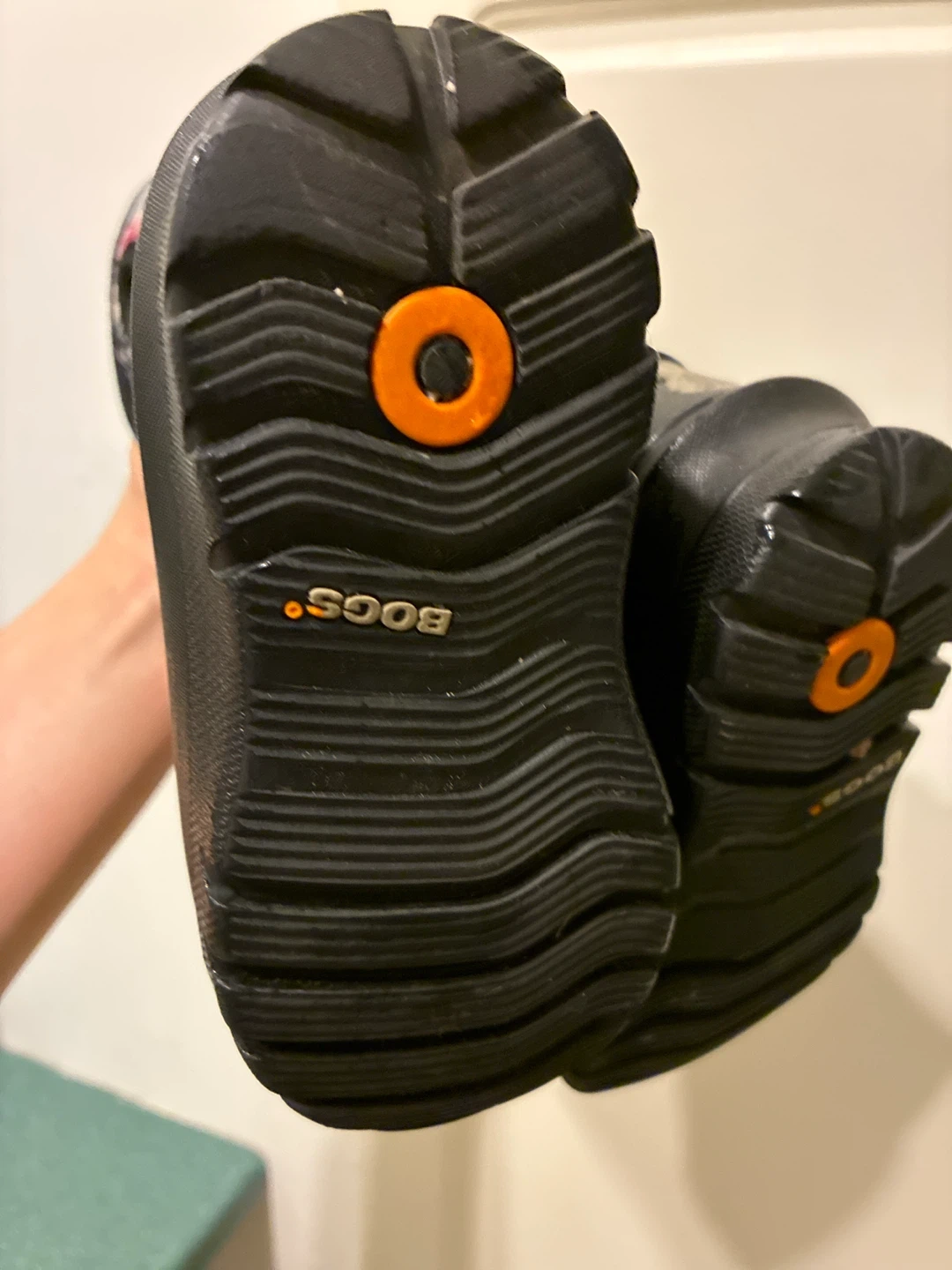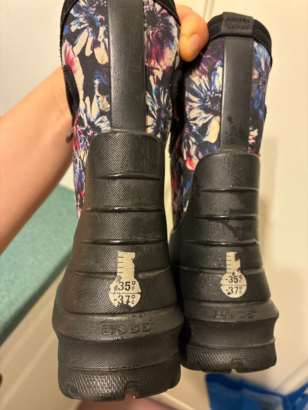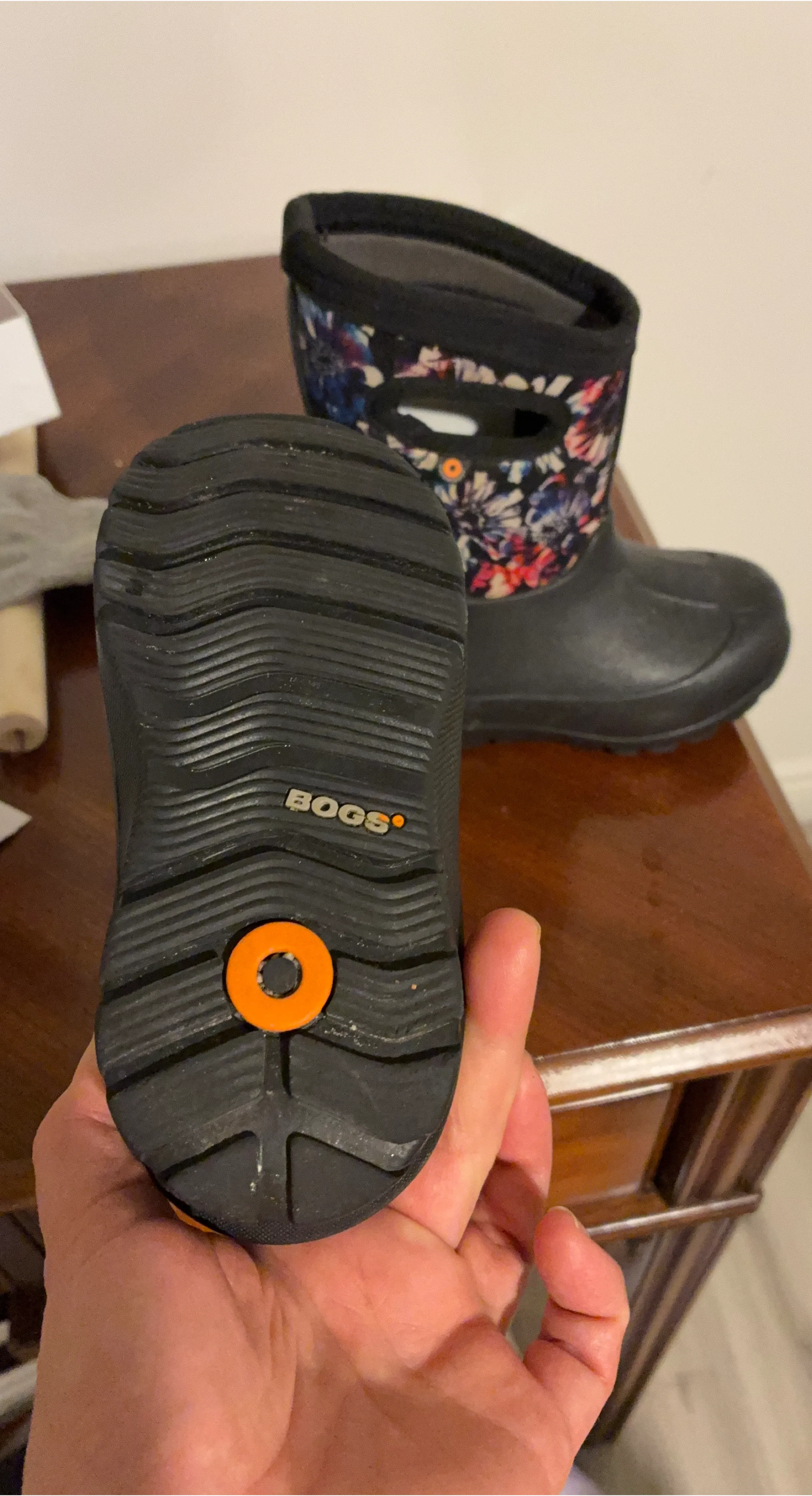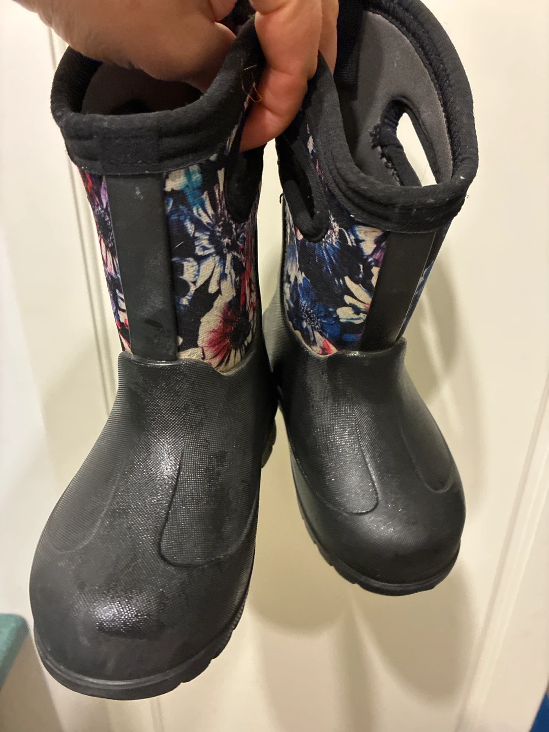 These Bogs kids' boots are perfect for keeping little feet dry and cozy! They feature a fun floral pattern on the upper part of the boot and a durable black waterproof base. Size 7.