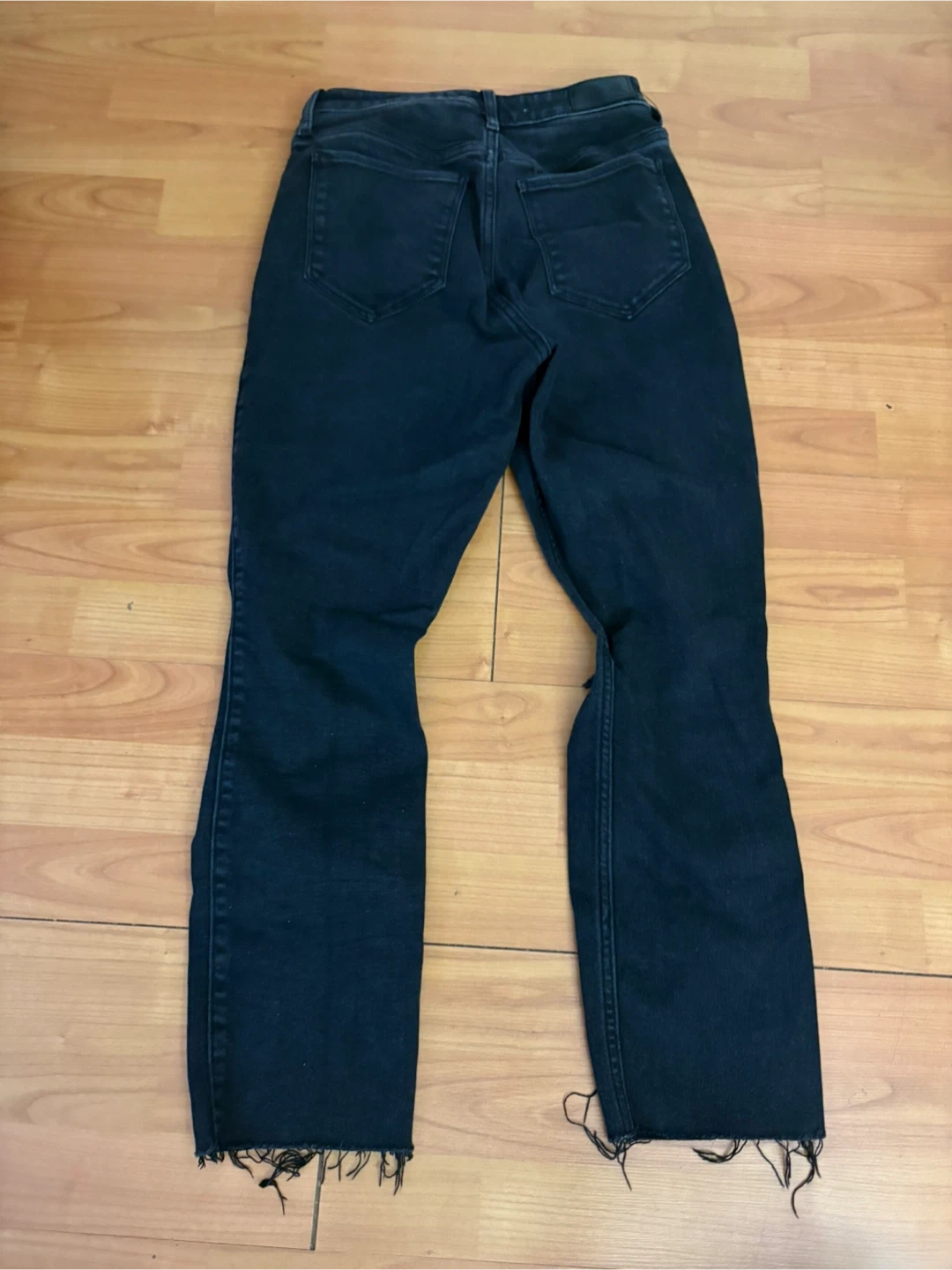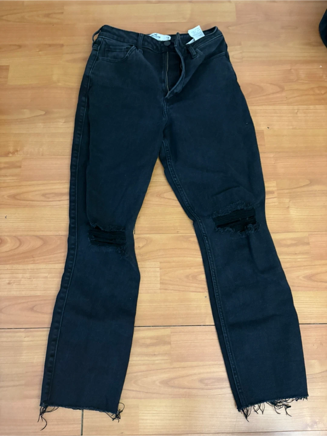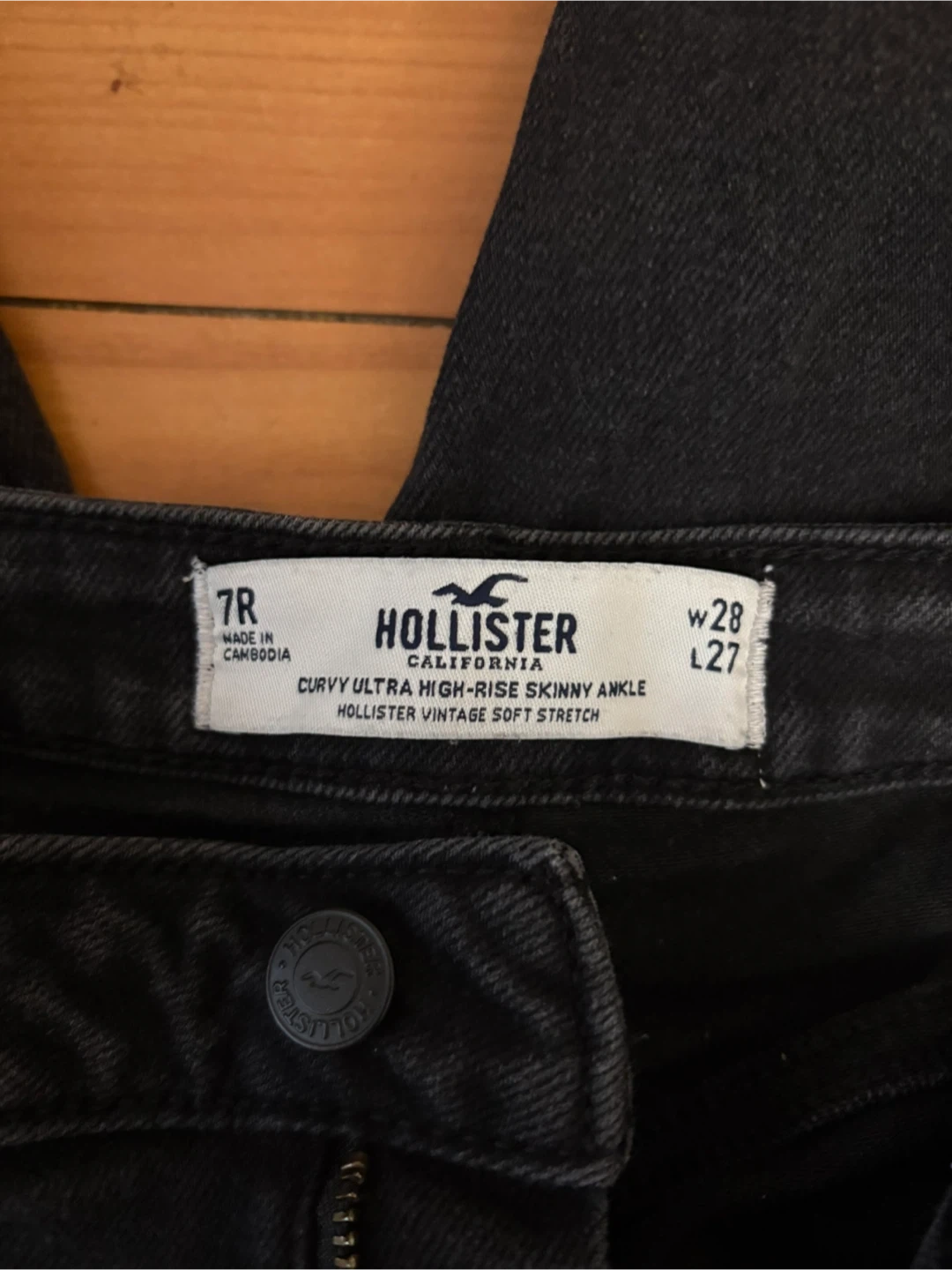 These are black Hollister jeans, size W28 L27. They feature a high-rise skinny ankle fit with distressed knees. Made with Hollister Vintage Soft Stretch fabric for comfort. Not a deep black more like the faded Black look