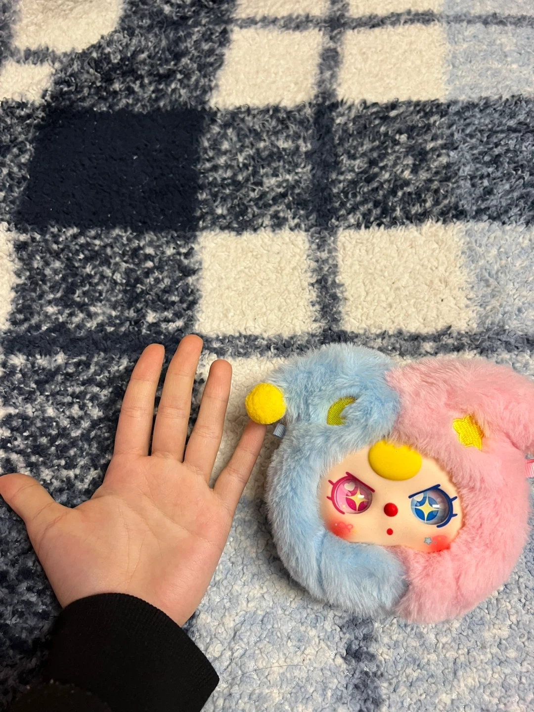 This cute plush features a unique character design with pink and blue fur. It's soft and fuzzy with embroidered eye details.