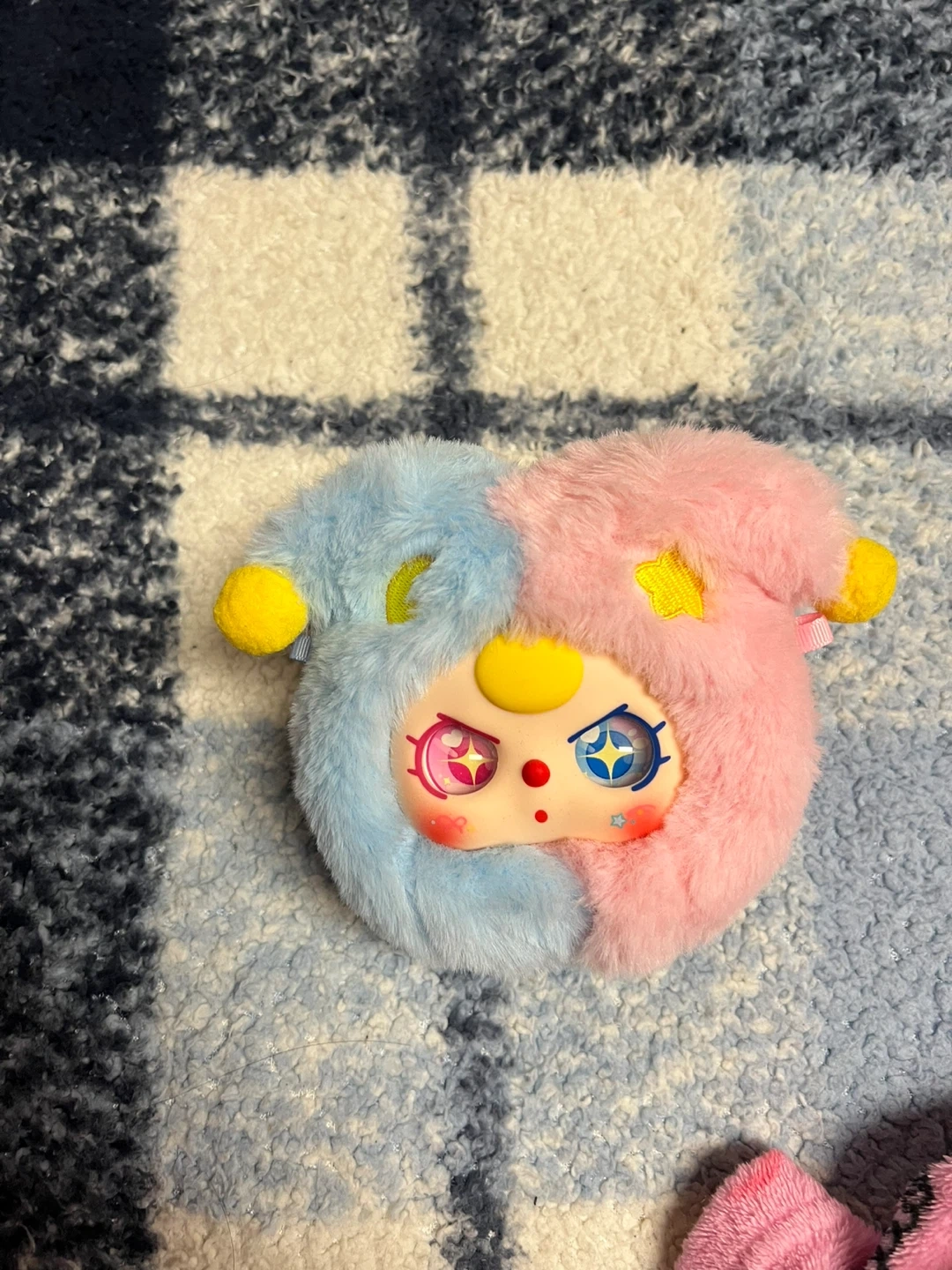 This cute plush features a unique character design with pink and blue fur. It's soft and fuzzy with embroidered eye details.