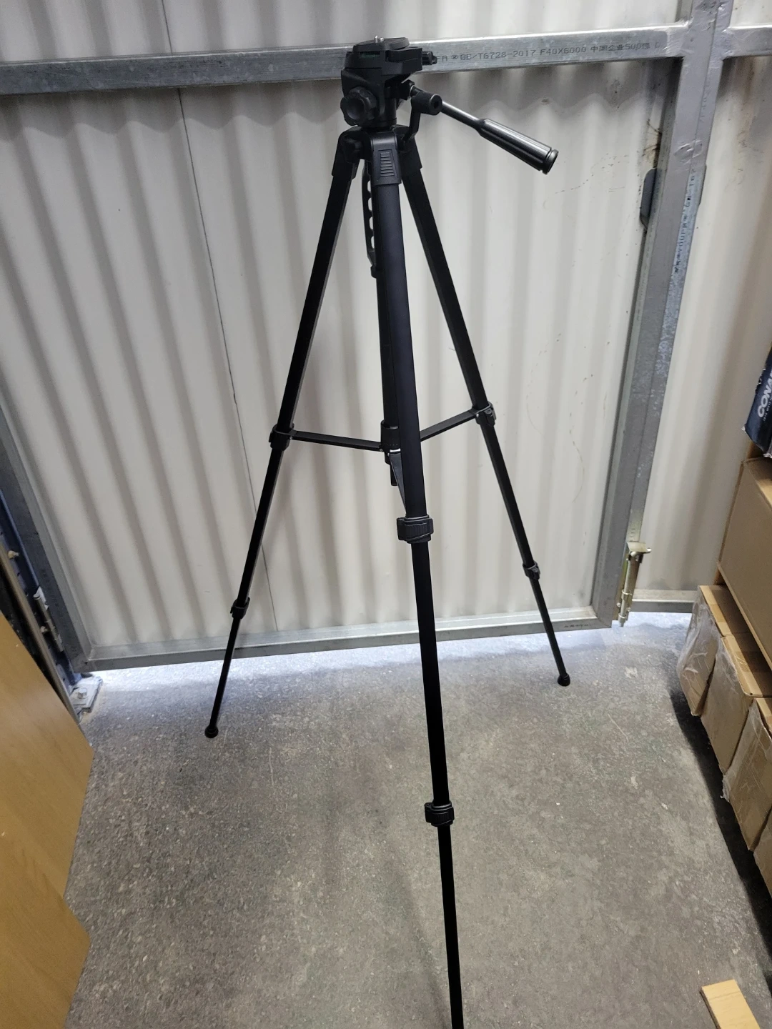This is a black camera tripod, new never used. It's made of aluminum and plastic. It includes a carrying bag for transport. Tripods offer stable camera support.