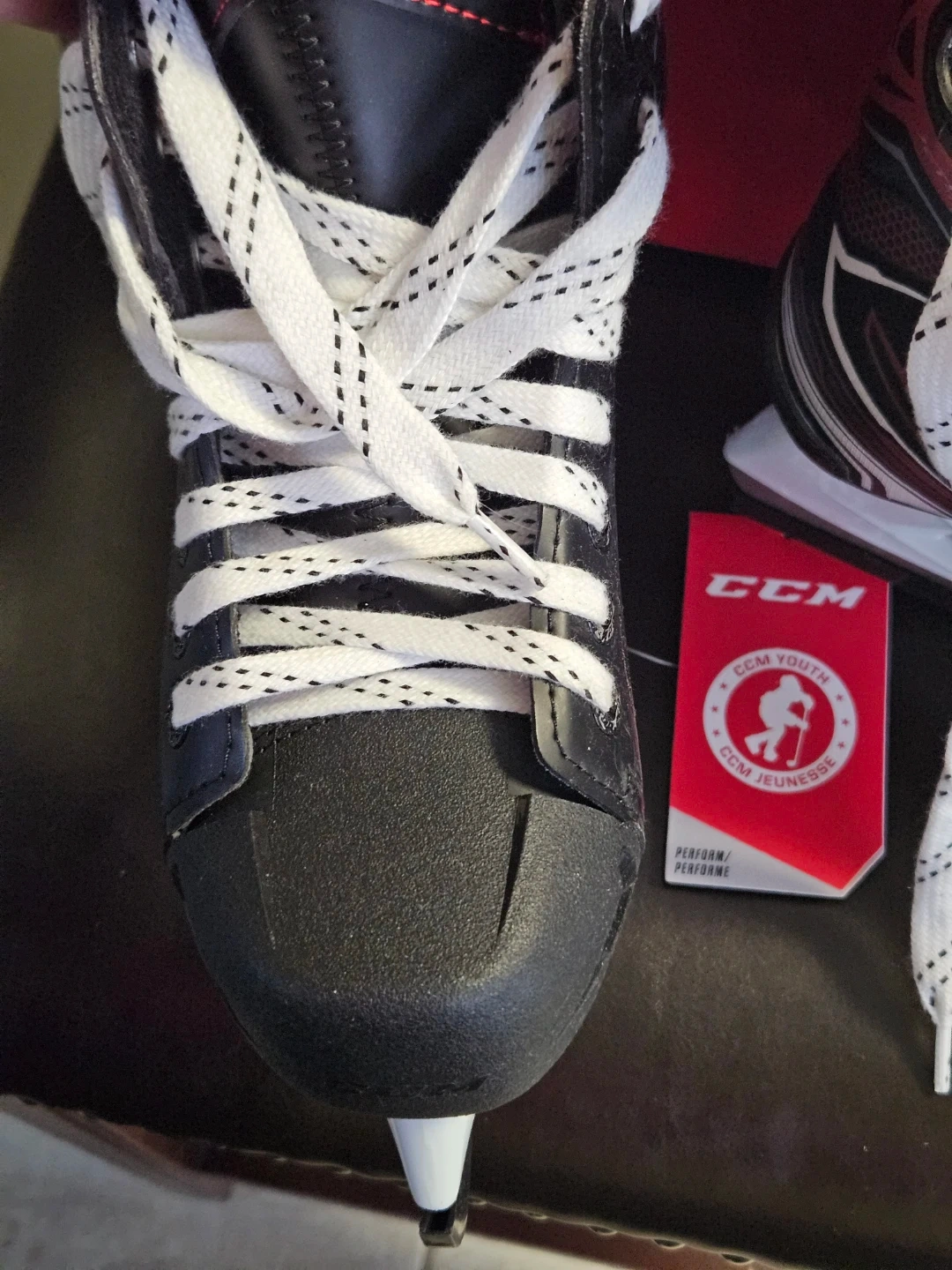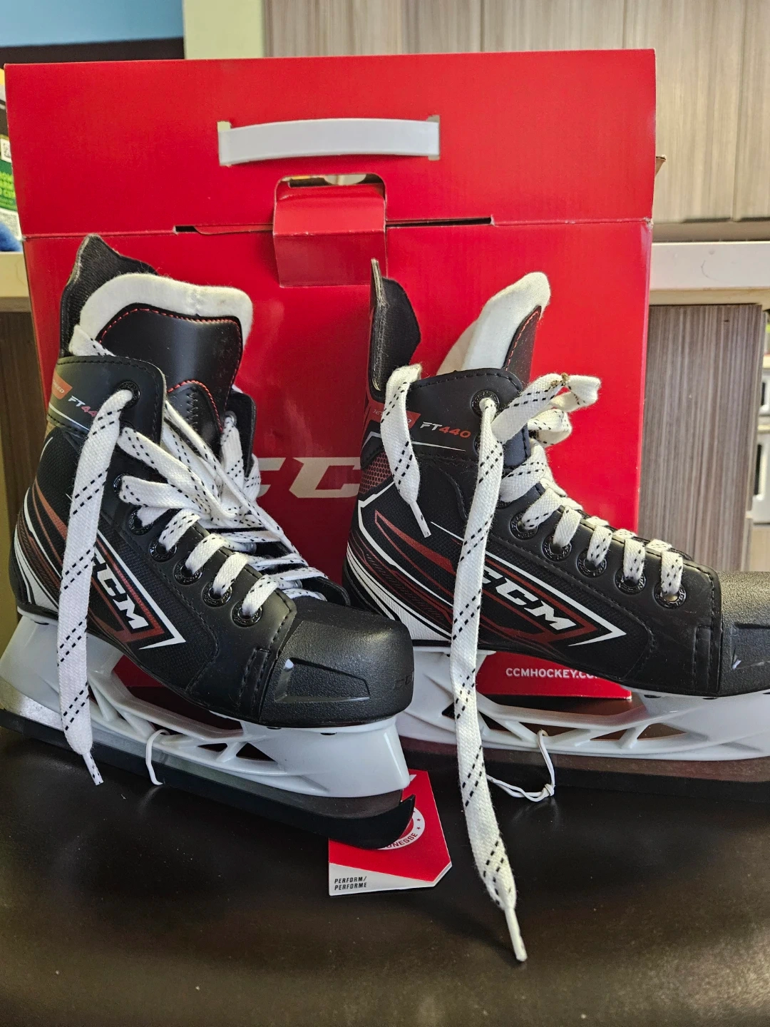 These are youth CCM JetSpeed FT440 hockey skates. They feature a black, red, and white design with white laces. Included is the original red CCM box.