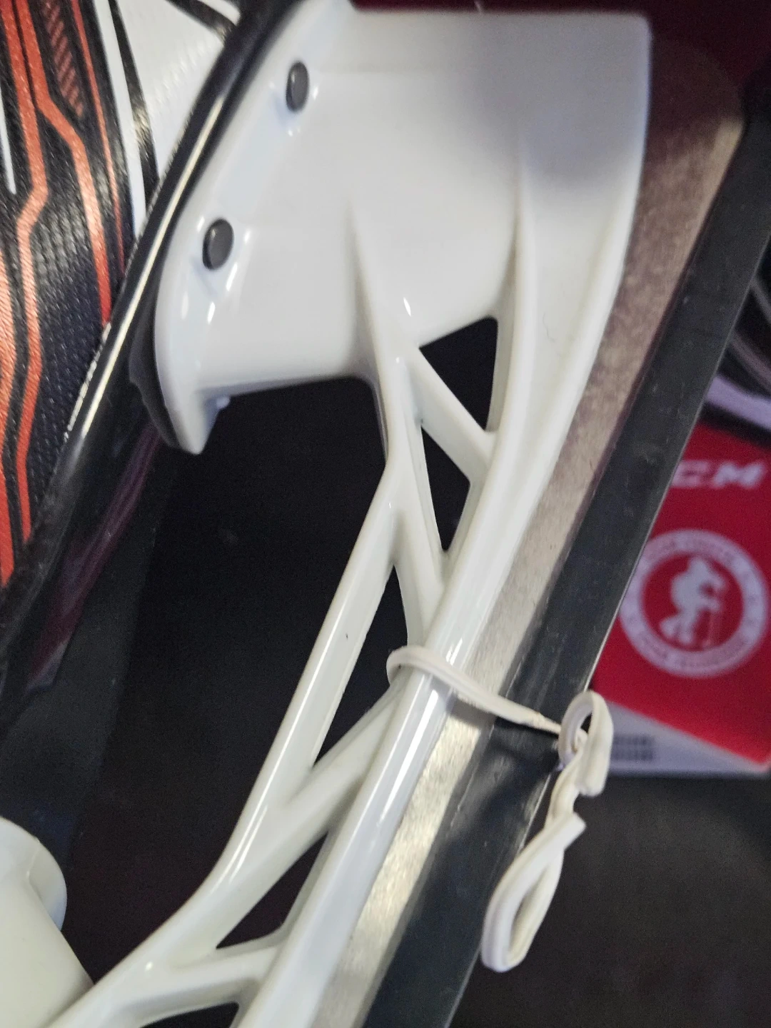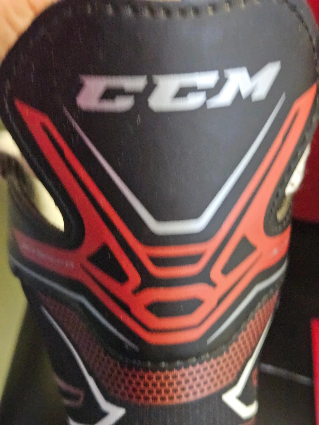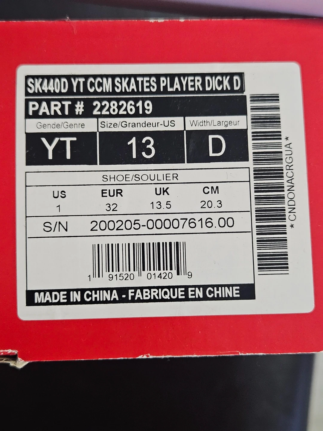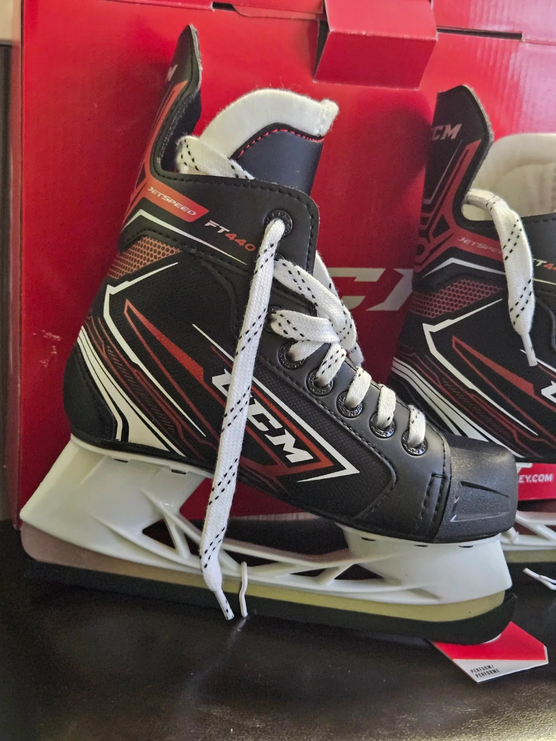 These are youth CCM JetSpeed FT440 hockey skates. They feature a black, red, and white design with white laces. Included is the original red CCM box.