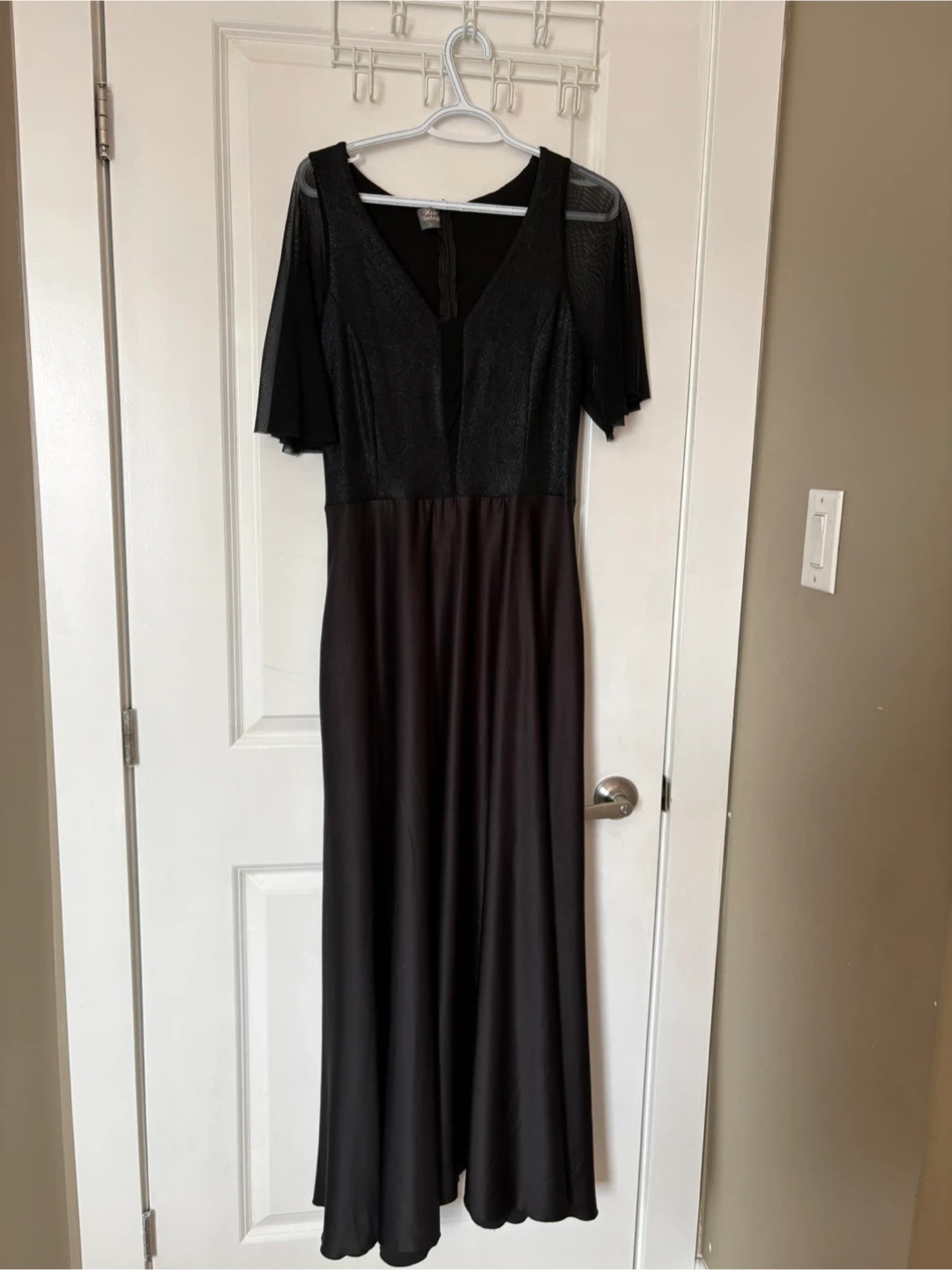 Elegant black maxi dress with sheer mesh short sleeves and a sparkling bodice. The dress has a V-neckline and a flattering A-line skirt. It's perfect for formal events or a night out!