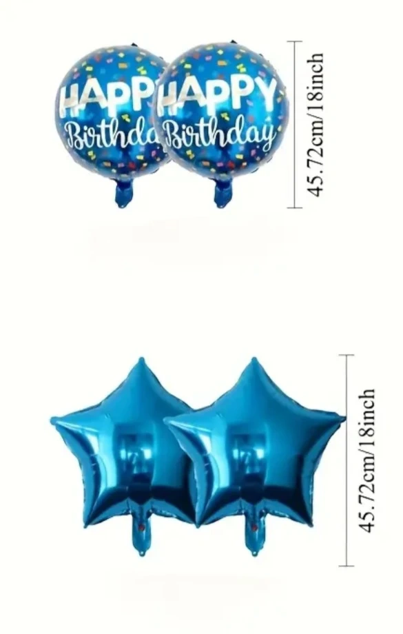Selling a set of blue 'Happy Birthday' balloons! There are two round balloons and two star-shaped balloons, each measuring approximately 18 inches. Perfect for adding a festive touch to any birthday celebration