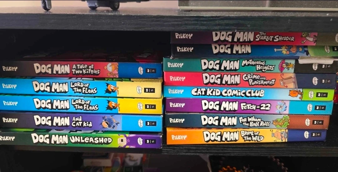 A collection of fun Dog Man and Cat Kid graphic novels by Dav Pilkey. Includes titles like 'Dog Man: Unleashed', 'Dog Man: A Tale of Two Kitties', 'Dog Man: Lord of the Fleas', 'Dog Man and Cat Kid', 'Dog Man: The Scarlet Shedder', 'Dog Man: Mothering Heights', 'Dog Man: Grime and Punishment', 'Cat Kid Comic Club', 'Dog Man: Fetch-22', 'Dog Man: For Whom the Ball Rolls', and 'Dog Man: Brawl of the Wild'. These books are great for young readers! Great for chapter book readers! Perfect for graphic novel fans! PICK-UP ONLY! Open for offers.